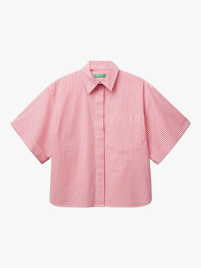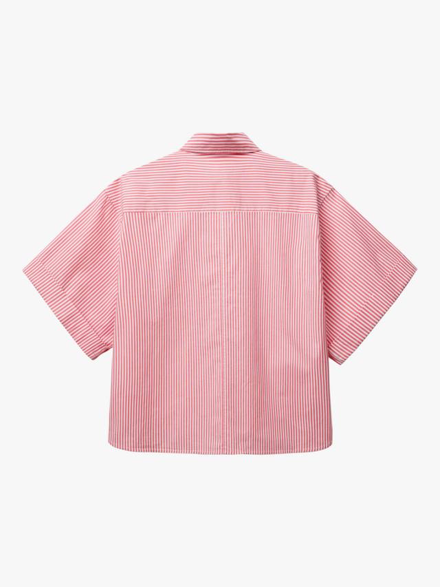 Рубашка с короткими рукавами и потайными пуговицами из окрашенного в полоску хлопка. Свободный крой, заостренный нагрудный карман. Кокетка сзади с двойной строчкой.