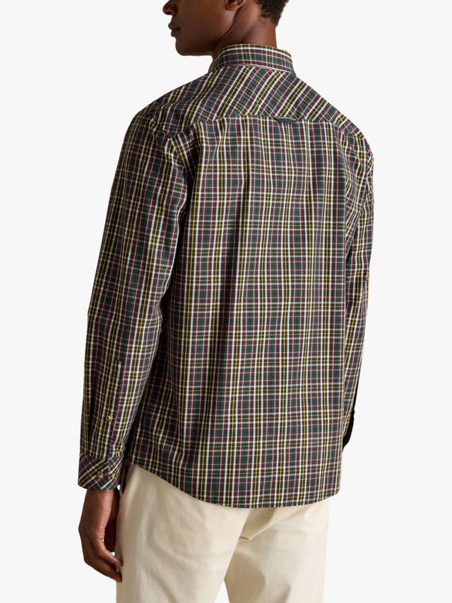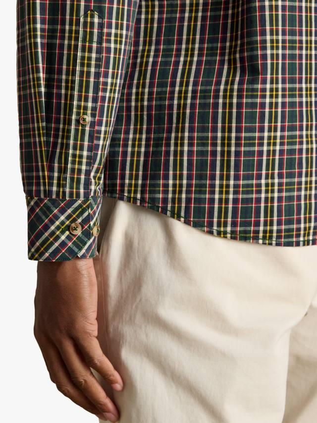 Хлопковый поплин, Классический крой, Персиковый эффект на ткани, Отделка из шамбре, Нагрудный карман с вышитым зайцем Joules, Застежка на пуговицы, Отложной воротник и манжеты на пуговицах.