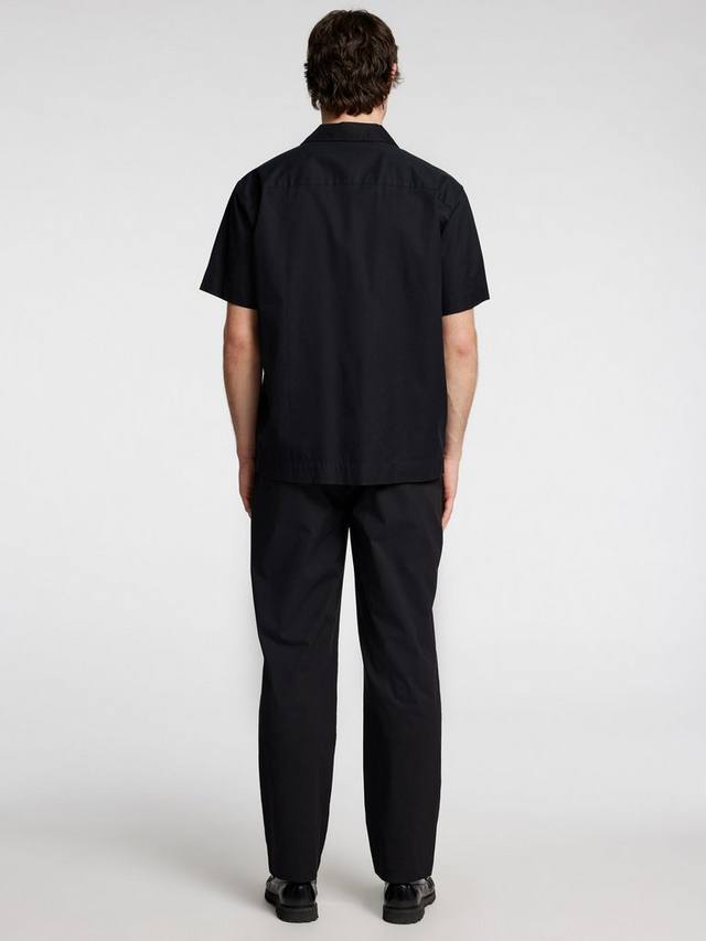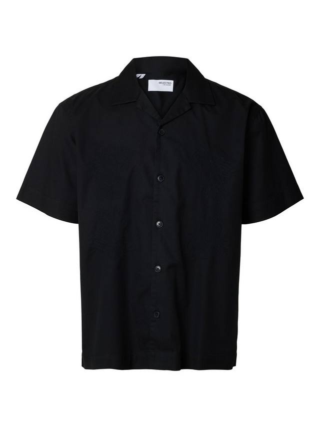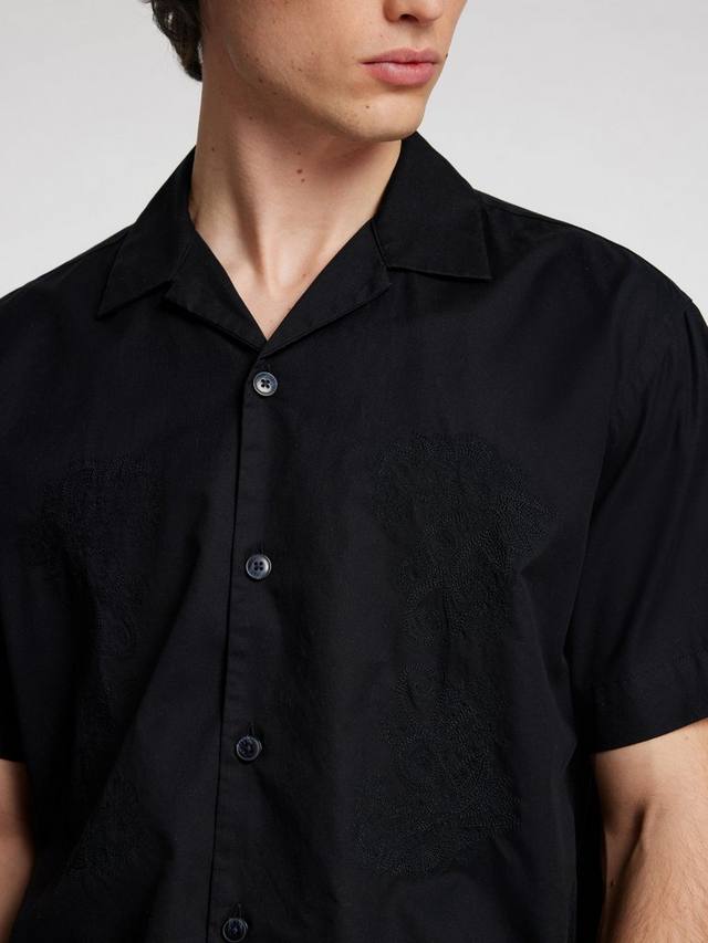 Рубашка с короткими рукавами, воротником-стойкой и застежкой на пуговицы. Изготовлена полностью из хлопка, имеет свободный крой, мягкую текстуру и удобную в носке.