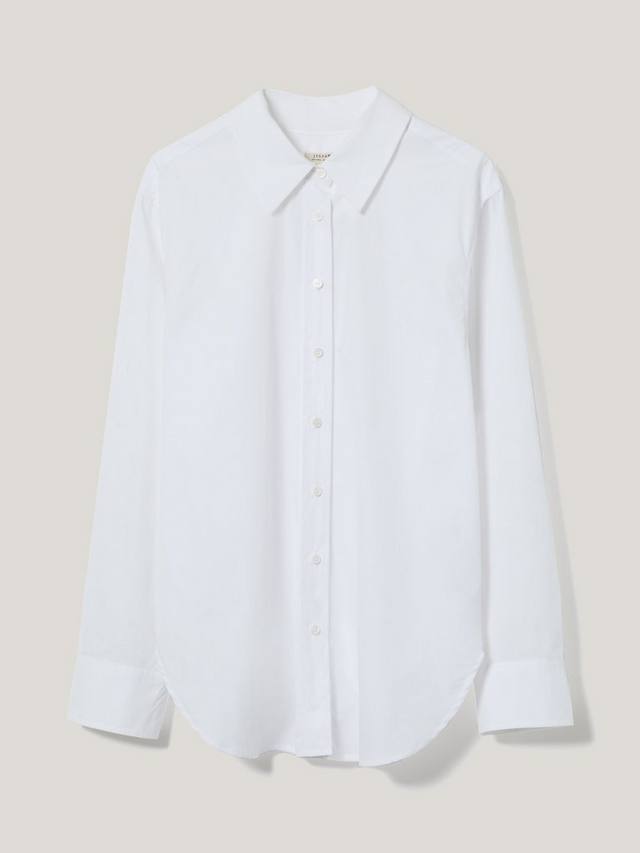 Классическая белая рубашка из хлопкового поплина – настоящая королева гардероба. Эта модель с боковыми разрезами, складкой и округлым подолом напоминает о классическом мужском стиле. Благодаря перламутровым пуговицам и отделке с отстрочкой свободный силуэт позволяет создавать множество образов. Носите рубашку заправленной или навыпуск, с закатанными или опущенными рукавами.