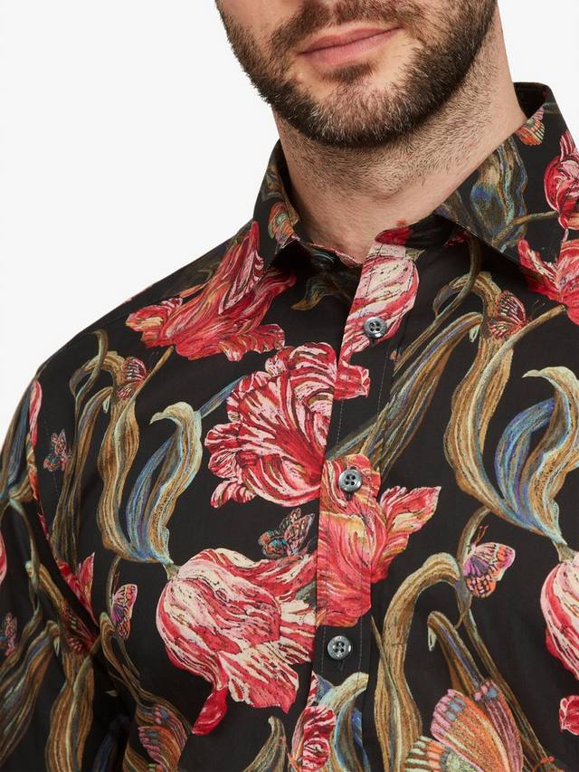 Этот принт от Liberty Fabrics посвящен одному виду цветка – тюльпану – и раскрывает множество разнообразных узоров, образуемых его лепестками. Рисунок выполнен мягким карандашом на черной бумаге, что придает ему текстуру и глубину, что делает эту рубашку по-настоящему эффектной. Идеально подходит под однотонный бархатный пиджак и в сочетании с качественными джинсами.