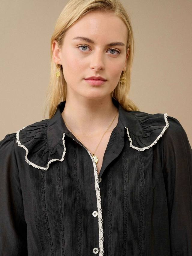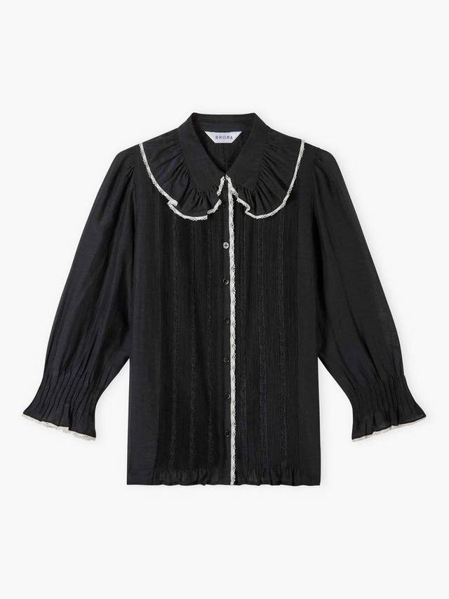 Компания Brora создала эту красоту из хлопка и шелка, сочетающую в себе замысловатые микроскладки, вышивку, контрастную кружевную отделку и большой, эффектный воротник-оборку.