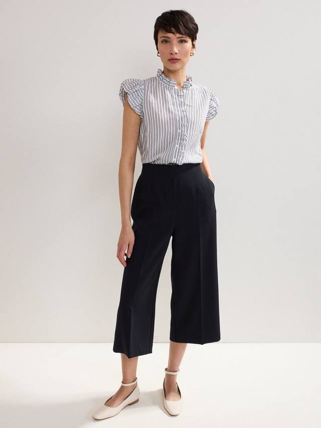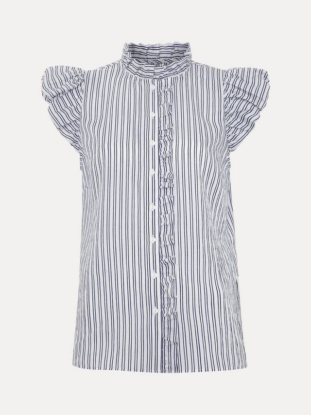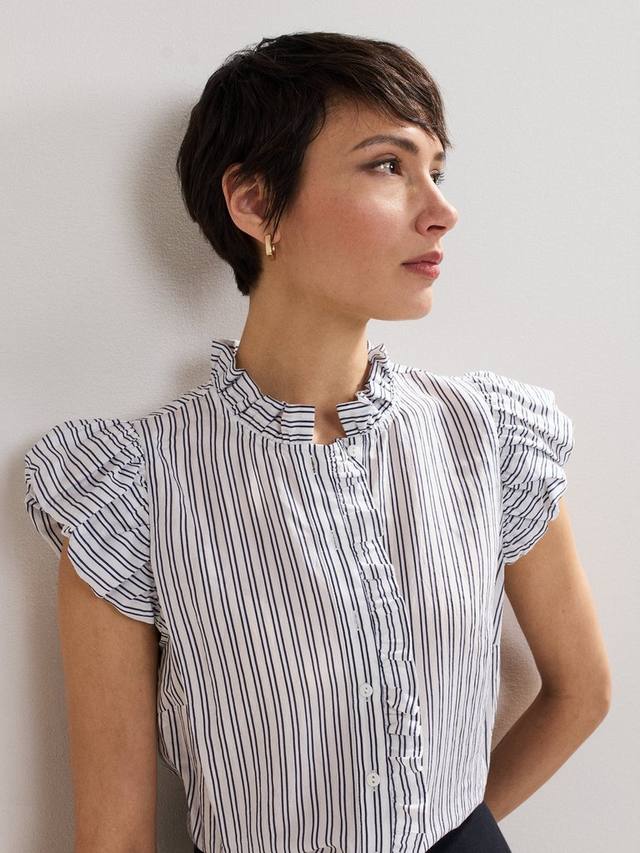 Современная интерпретация классической рубашки в полоску. Оборки по всей длине придают ей женственность, а силуэт без рукавов делает ее идеальной для теплых дней в сочетании с повседневными брюками и обувью без каблука.