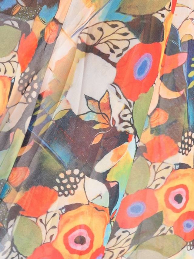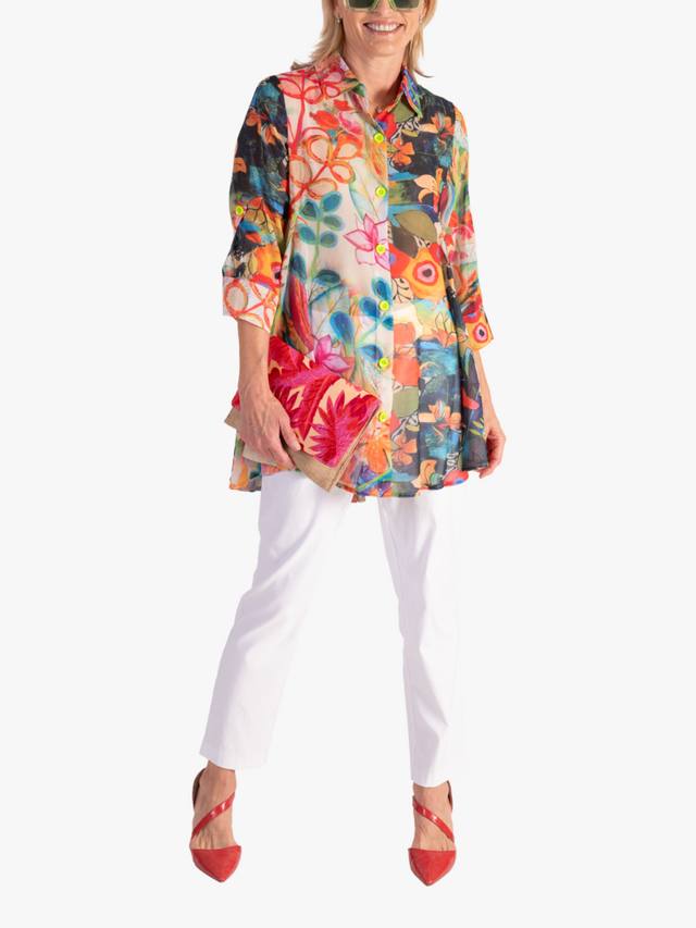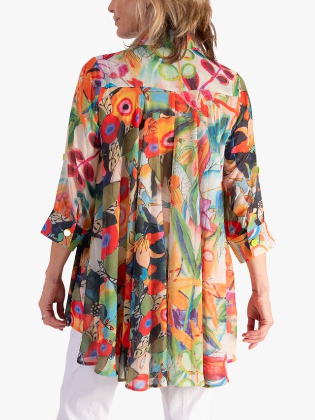 Эта блузка свободного кроя, которая произведет впечатление на вас по утрам по дороге на работу, мгновенно поднимет настроение благодаря своему артистичному цветочному принту, наполненному цветами, в ярких летних тонах. Блузка с четким воротником, рукавами три четверти и асимметричным подолом выполнена из легкой, но прочной шифоновой ткани и идеально подходит для непринужденного дневного ношения.