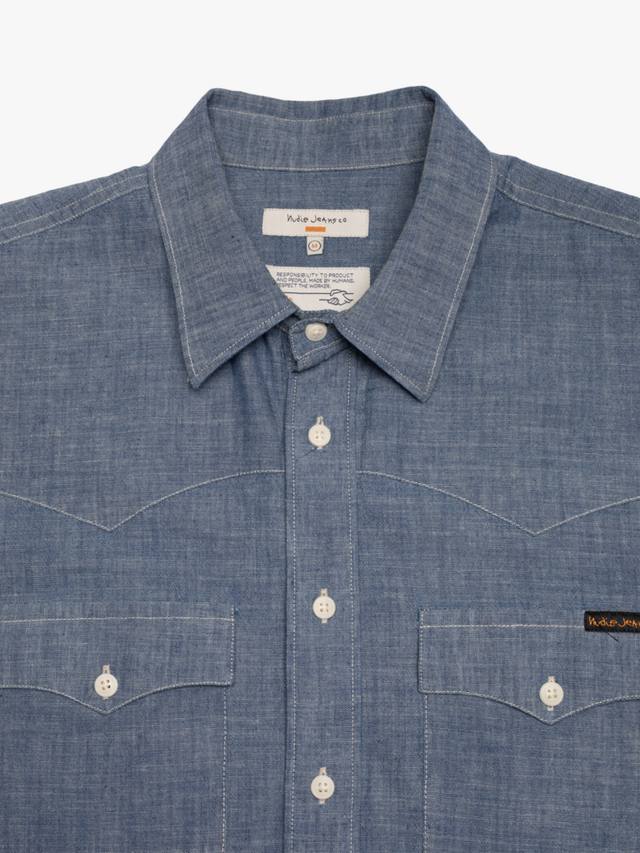 Эта рубашка с короткими рукавами сшита из любимой турецкой ткани шамбре Nudie Jeans. Она красивого средне-синего оттенка и сухая, прохладная на ощупь. У неё заострённая кокеточка спереди и сзади, а также закруглённый нижний край. Хлопок, используемый для этой одежды, органический, и когда вы покупаете эту рубашку, вы можете быть уверены, что мы заплатили свою долю прожиточного минимума.
