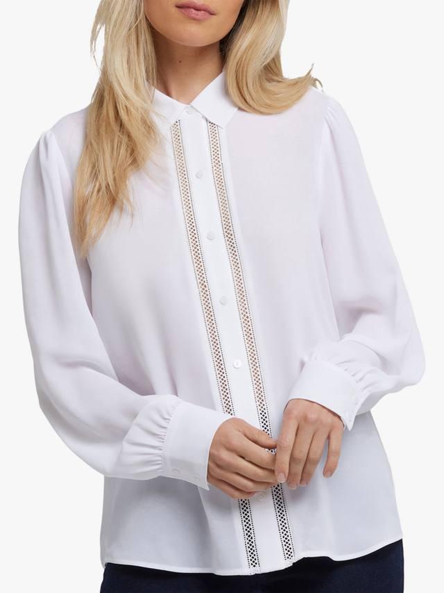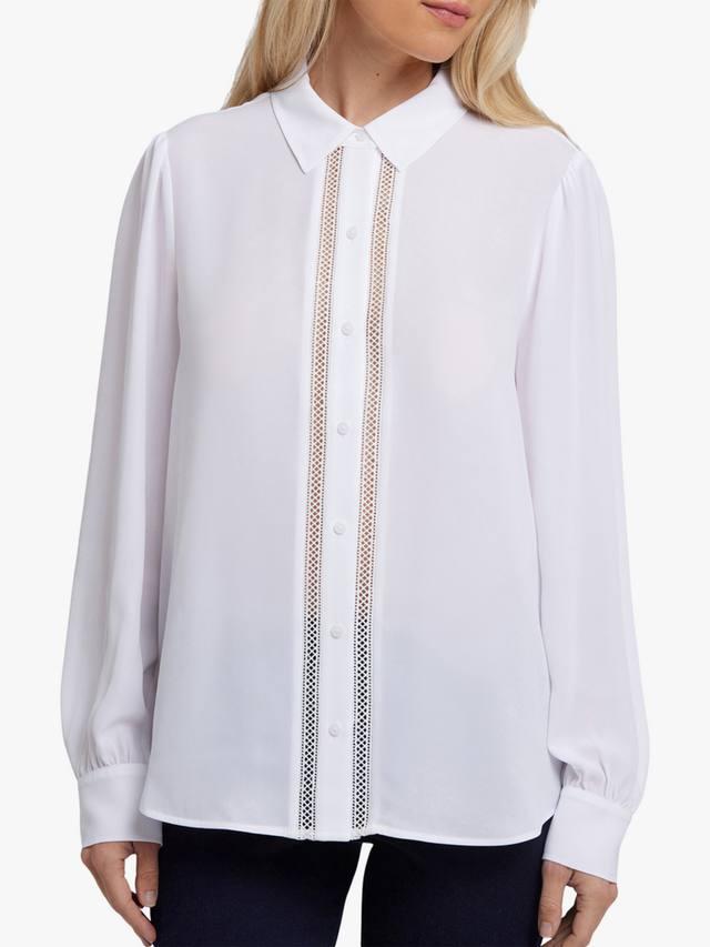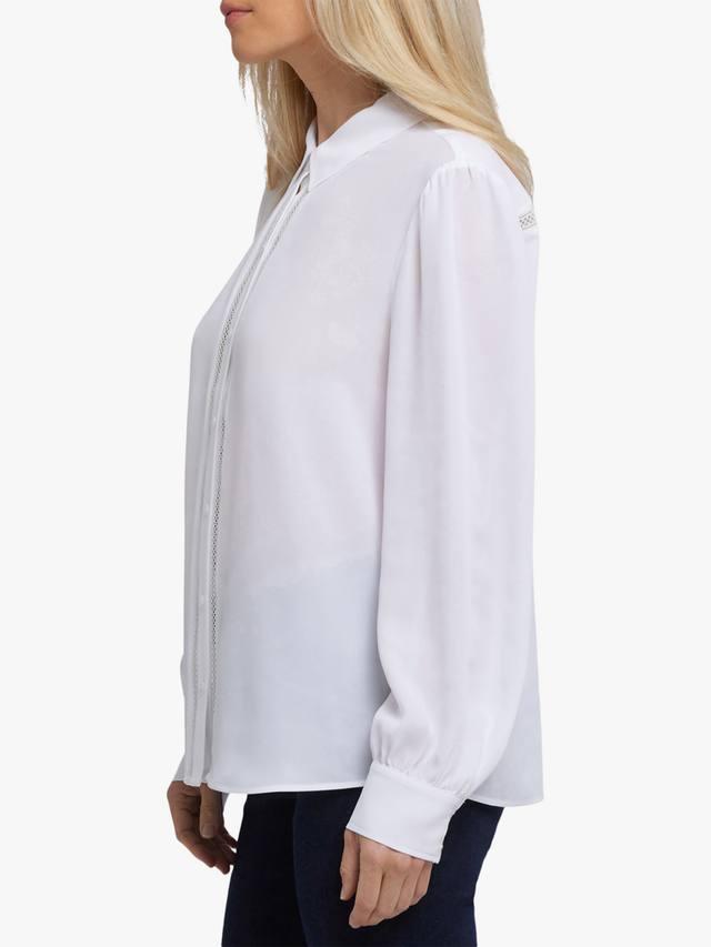 Классический стиль сочетается с элегантными деталями в блузке Tiffany от NYDJ. Эта блузка из жоржета с эффектной драпировкой спереди застегивается на пуговицы. Она имеет острый воротник, длинные рукава с манжетами на пуговицах и сутажную отделку вдоль планки с пуговицами и кокеткой на спинке. Сборки на плечах, манжетах и по центру спины придают изделию красивый вид.