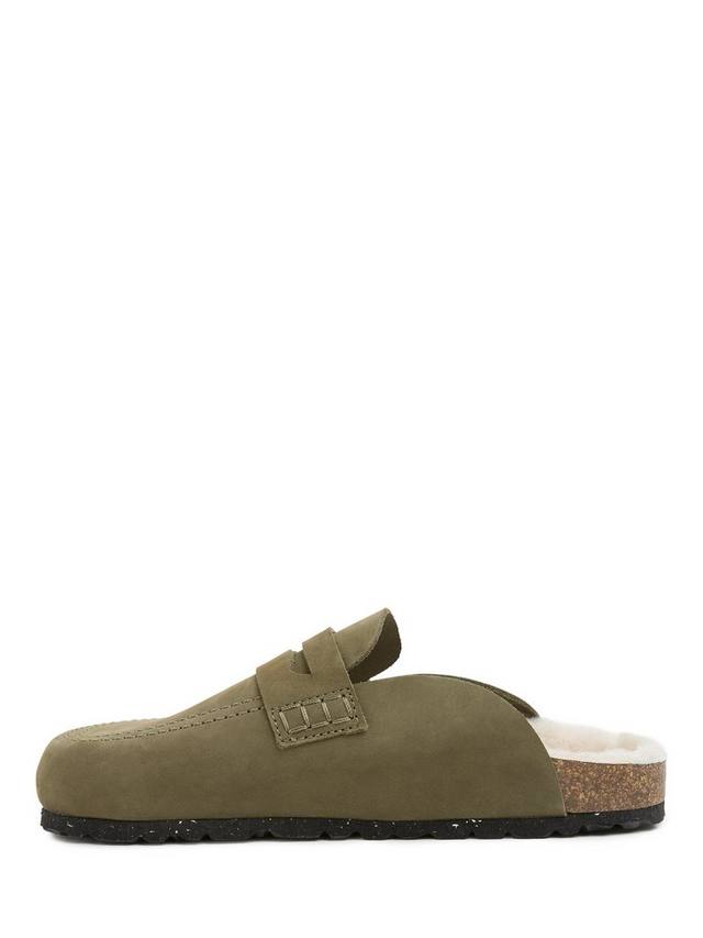 Сабо с отделкой в стиле пенни-лофер с нубуковым верхом. Стелька роскошно отделана натуральной овчиной, дополнена пробковой промежуточной подошвой и подошвой из ЭВА.