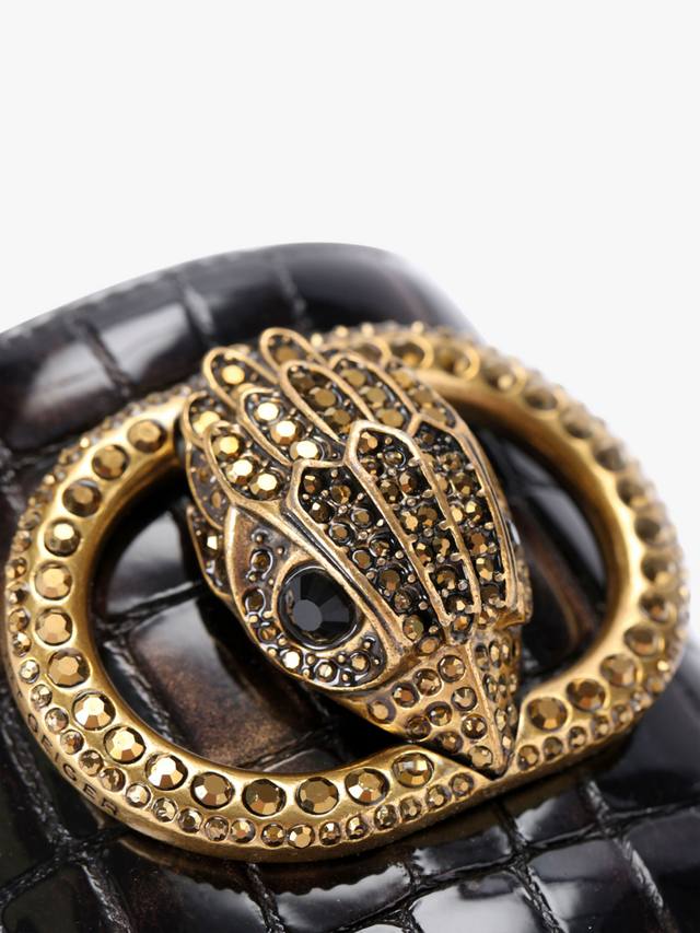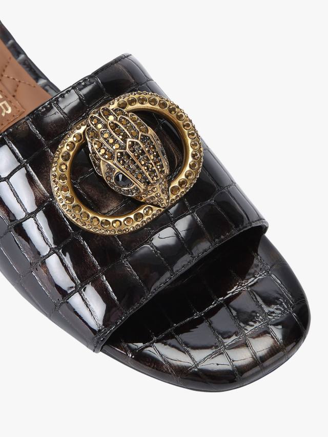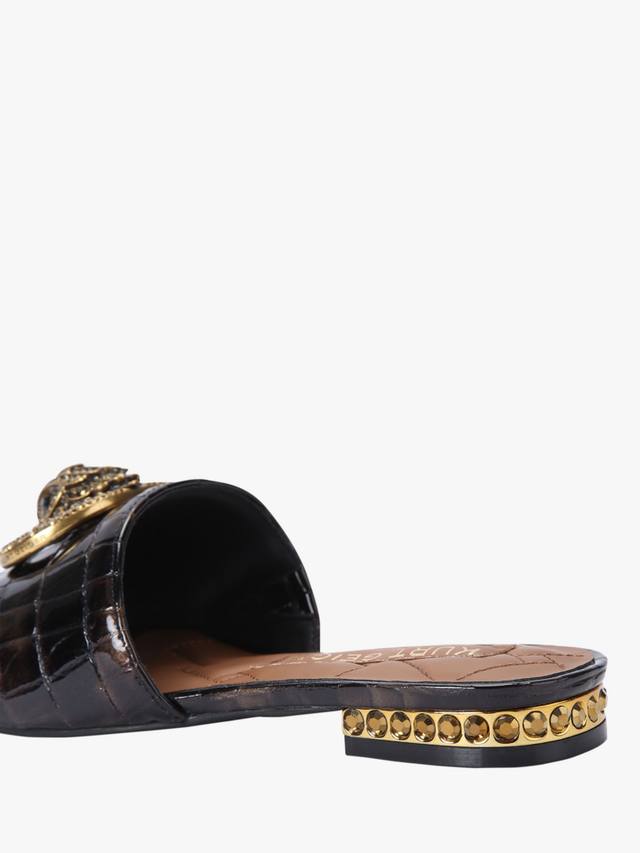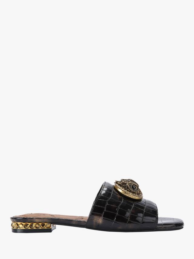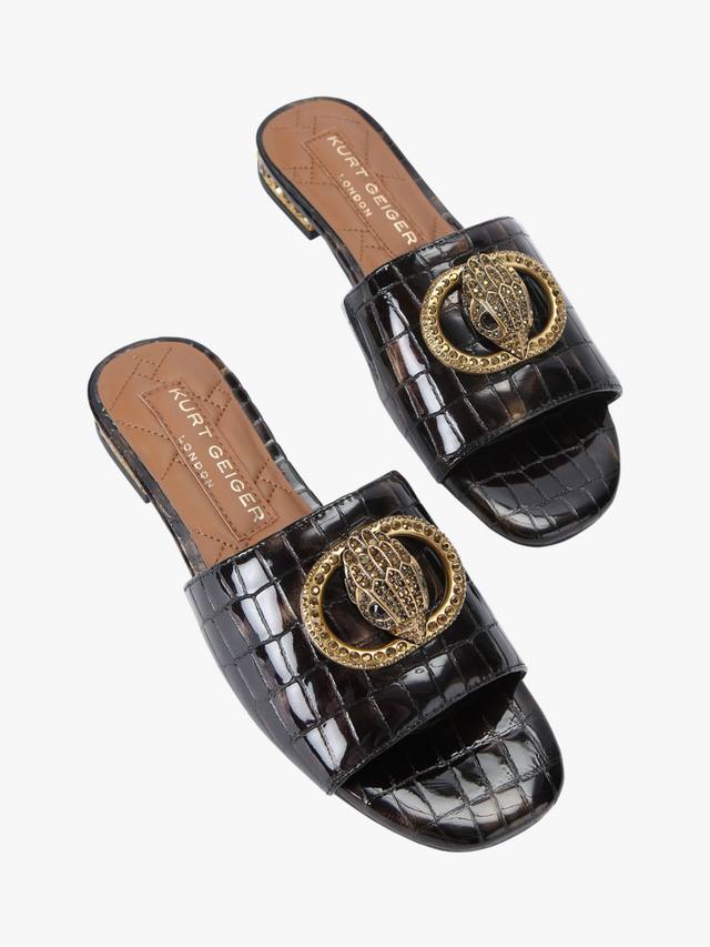 Эти сандалии Kurt Geiger London Chelsea Flat Sandals без застежки оснащены ремешком с тиснением в виде змеи, который перекидывается через ногу. Ремешок на носке украшен пряжкой из состаренной латуни и головой орла, украшенной кристаллами. Низкий каблук также украшен кристаллами.