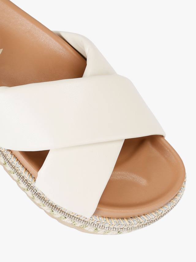 Fascino от Carvela — это босоножки на плоской подошве с двумя широкими закрытыми ремешками из искусственной кожи. Плоская подошва украшена металлическими веревочками и кристаллами.