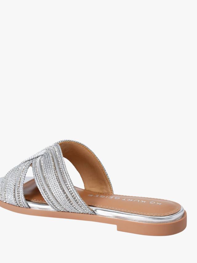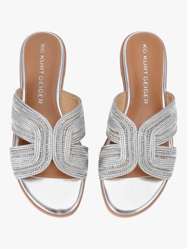 Эта пара сандалий на плоской подошве от KG Kurt Geiger, ставшая фаворитом в теплое время года, выполнена из прочного металлического верха. Они установлены на плоской пятке и дополнены открытым закругленным носком.