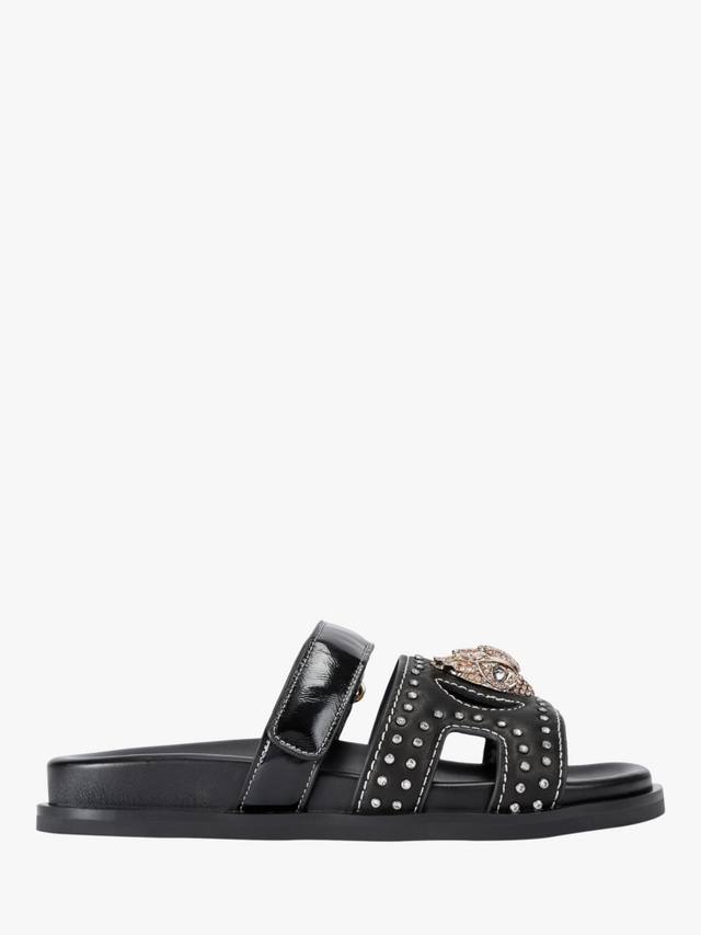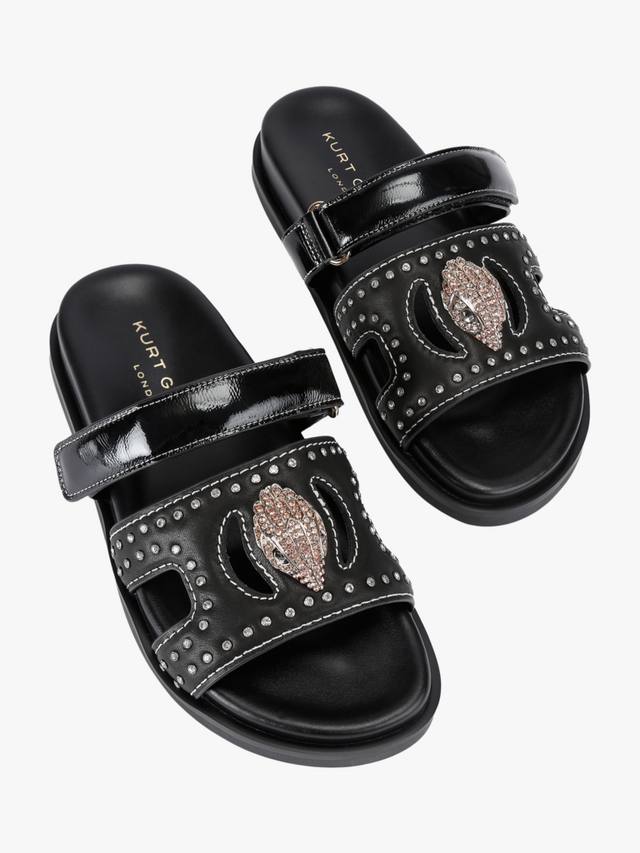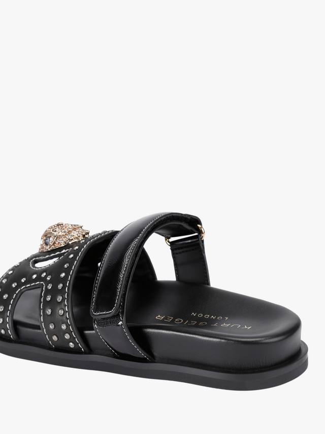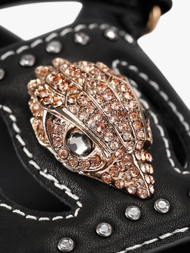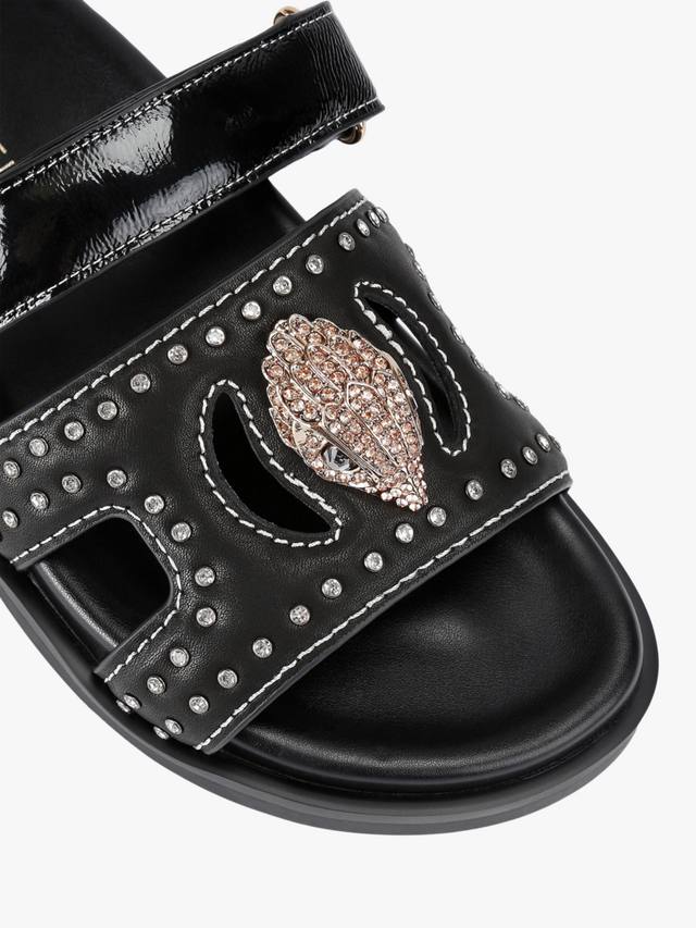 Эти босоножки с вырезом в виде орла от Kurt Geiger London изготовлены из черной кожи. Они имеют более тонкую застежку-липучку на липучке по всей стопе и широкий ремешок на носке с кристаллами. Ремешок также украшен золотой головой орла, украшенной кристаллами.