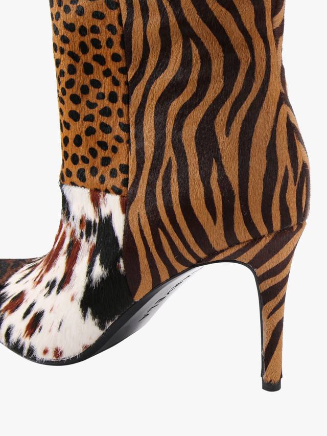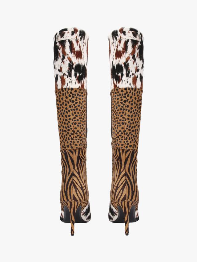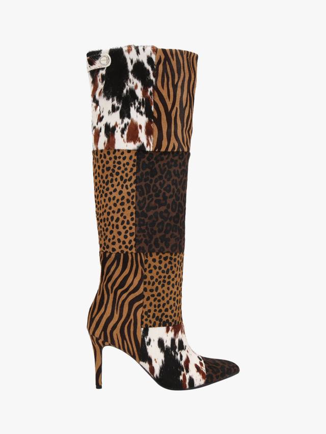 Эти высокие сапоги Amore изготовлены из лоскутной телячьей кожи с различными анималистичными принтами. Каблук — шпилька.