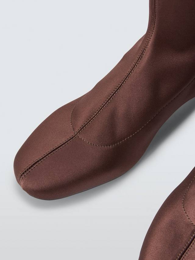 Изготовленная из мягкого шоколадного эластичного атласа, эта модель идеально подходит для ношения под юбками миди или джинсами. Блочный каблук придает образу устойчивость и структуру, обеспечивая идеальный баланс между комфортом и выразительностью.