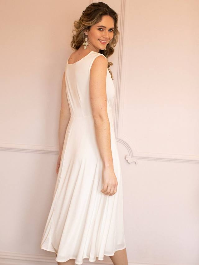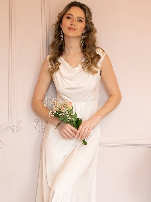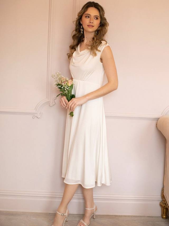 Ощутите винтажный стиль в свадебном платье Darcie Midi. Изготовленное из мягчайшего блестящего трикотажа, это платье-мечта будет сопровождать вас, обеспечивая комфорт как на церемонии, так и на торжестве. Изящный вырез-хомут добавит нотку непринужденного гламура, а облегающая юбка с расклешенным лифом создаст ощущение, будто вы кружитесь в танце.
