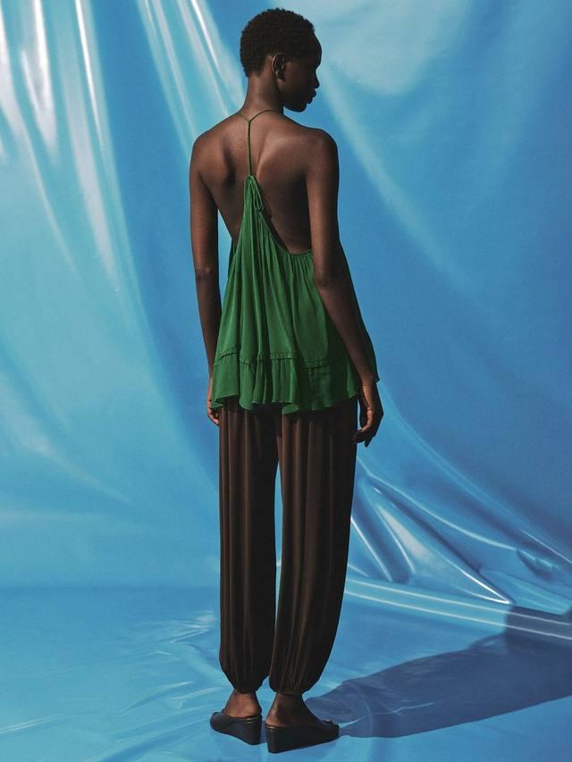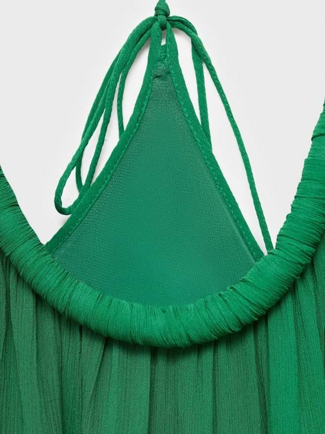 Эта тонкая блузка на бретельках обеспечит вам комфорт на любой вечеринке благодаря гладкой подкладке со свободным круглым вырезом и оборкой по низу.