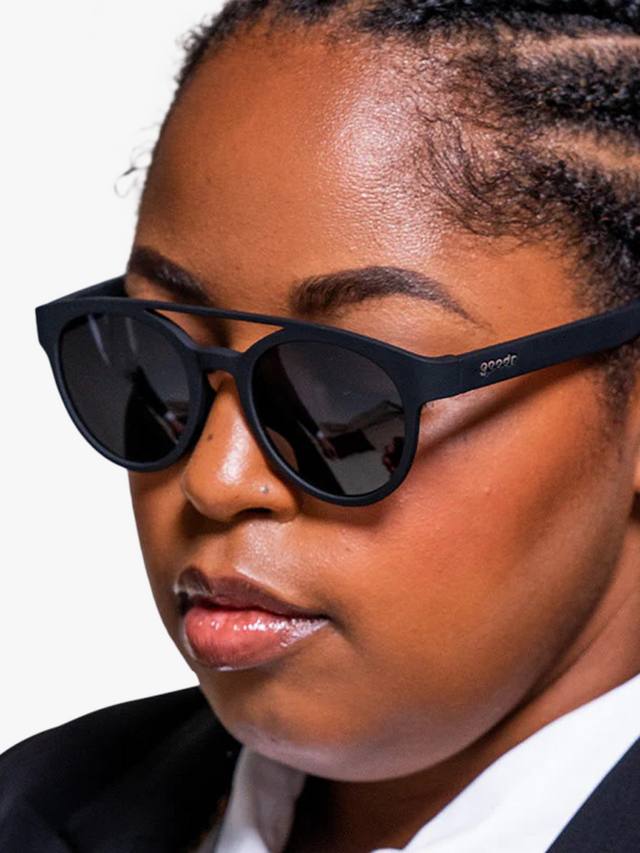 Черная оправа с черными антибликовыми линзами и характерной двойной переносицей.