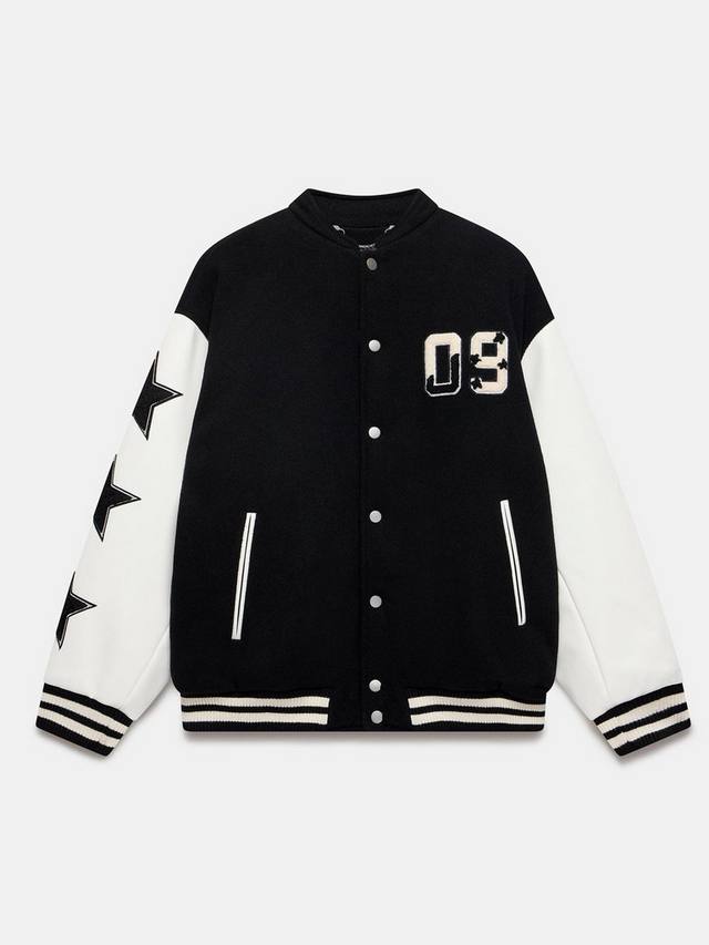 Куртка в стиле бомбер с воротником, цифрами и звездами, длинными рукавами, прорезными карманами, полосатой отделкой, узором на спине и застежкой на кнопку спереди.