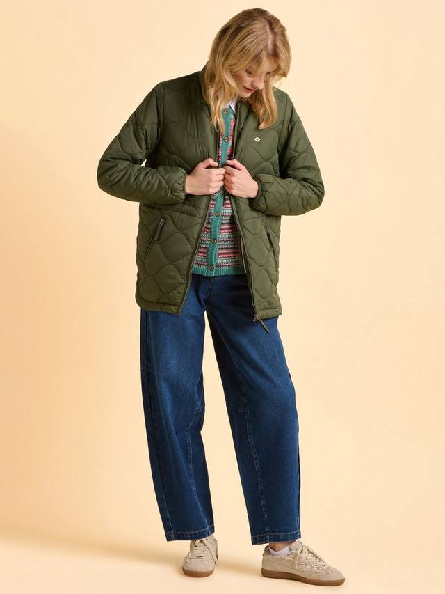 Уютное стеганое пальто для комфорта в прохладные дни. Классический крой, ромбовидная стёганая строчка, четыре глубоких кармана, завязка на талии и застёжки на молнии и кнопках. Наденьте поверх брюк из толстой вязки и вельвета.