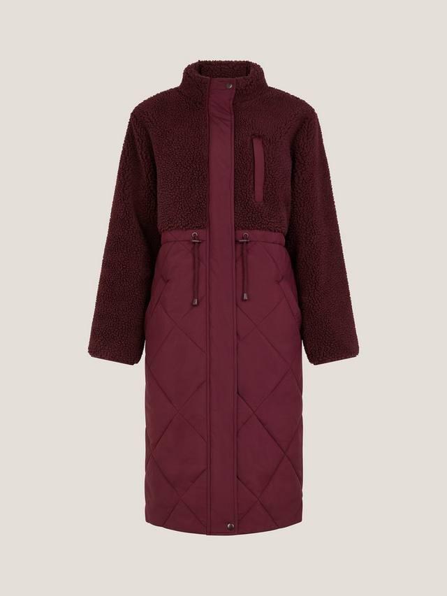 Это стеганое пальто украшено уютными акцентами из бордового меха на лифе и рукавах. Боковые карманы и незаметная застежка-молния.