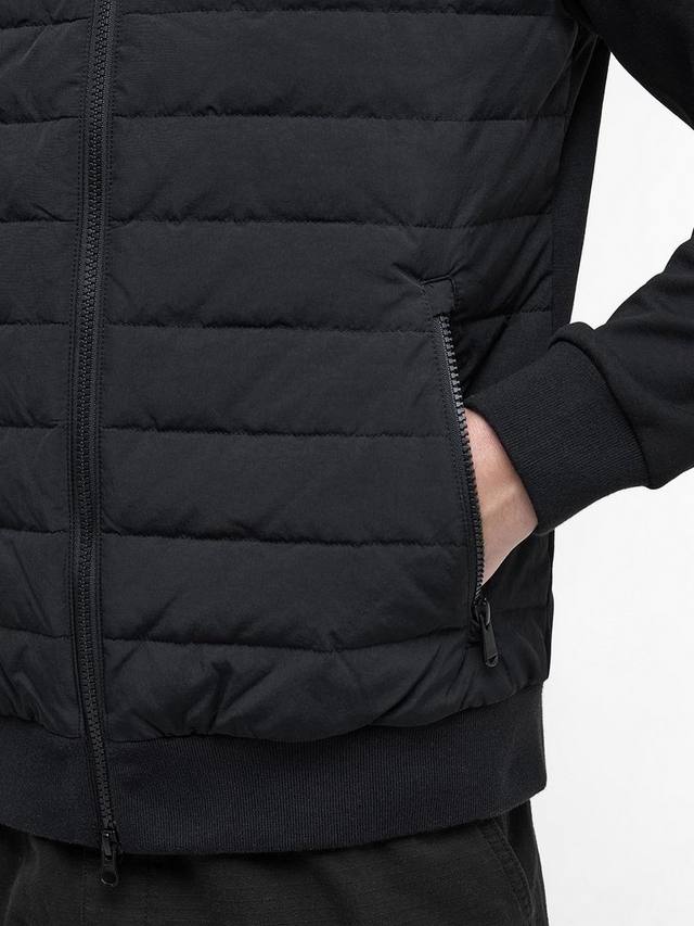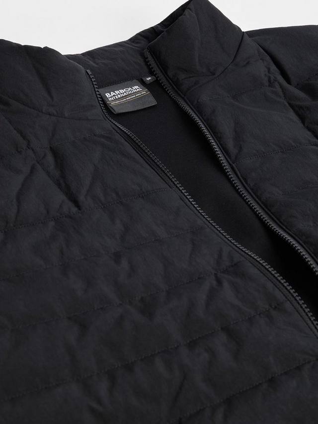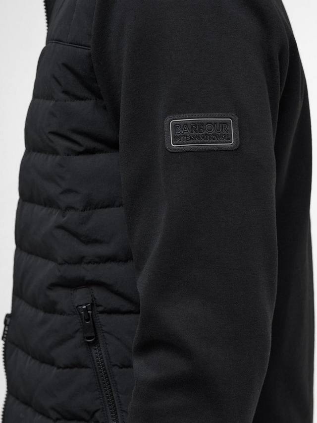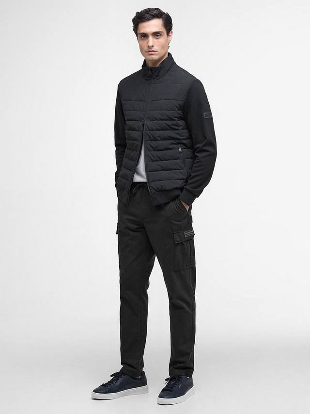 Свитшот Barbour International Collins Baffle Quilted Sweat, застегивающийся на молнию и имеющий тональную стёганую переднюю панель, идеально подходит для спортивного образа и активного отдыха. Ребристые манжеты и подгиб, два кармана на молнии на бедрах и ромбовидный логотип Barbour International на левом рукаве.