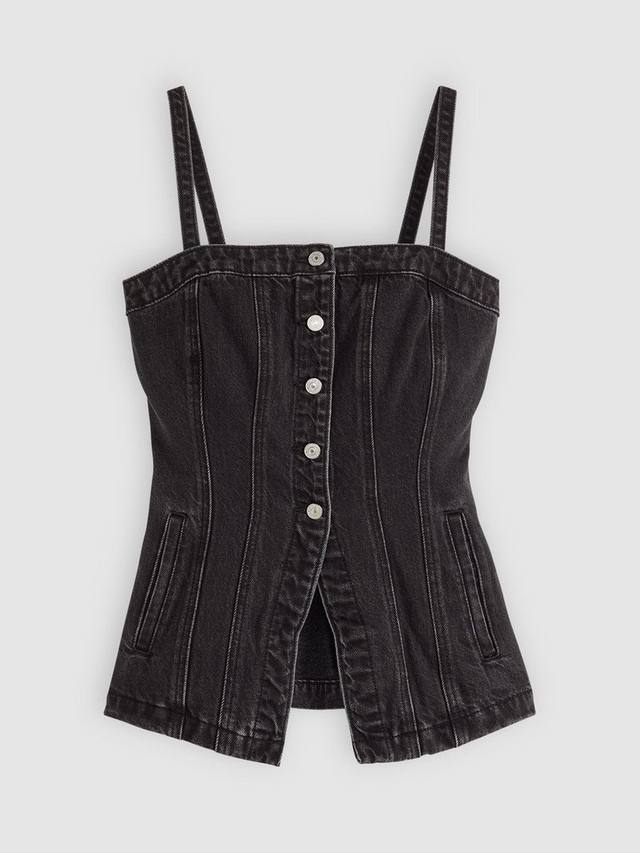 Смелый, подчеркивающий фигуру и в меру смелый. Топ-бюстье скроен по фигуре, имеет мягкий квадратный вырез, застегивается на пуговицы спереди и выгодно подчеркивает фигуру.