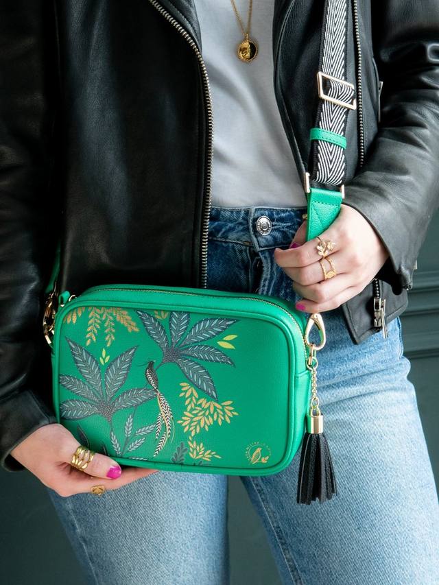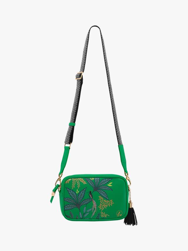 Сумка для фотоаппарата Sara Miller — идеальный аксессуар как для дня, так и для вечера. Регулируемый плечевой ремень с шевронной тесьмой и компактный размер делают её отличным спутником в походах по магазинам. Яркие веселые принты, вдохновленные природой, добавят ярких красок в ваш наряд, а декоративные детали из золотой фольги и игривая кисточка добавят блеска.