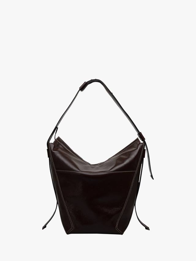 Вместительная сумка через плечо, выполненная в форме мешковатой сумки. Эта вместительная модель отличается пропорциями и практичностью благодаря регулируемому удлиненному ремню, массивной молнии и длинному кожаному ремню. Изготовлена из больших панелей мягкой зернистой кожи, сложенных подобно оригами, с угловыми швами. В комплекте пылезащитный мешок.