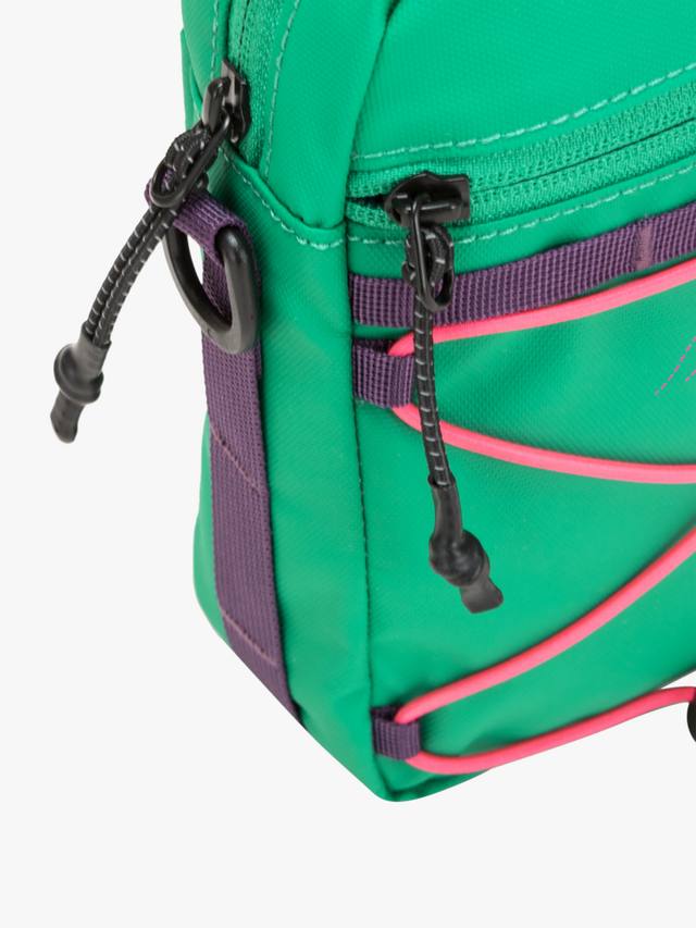 Внешняя сторона сумки застёгивается на молнию, что обеспечивает лёгкий доступ к её внутреннему пространству во время движения. Спереди расположен регулируемый эластичный карман для хранения, идеально подходящий для внешнего хранения. Регулируемое отверстие на молнии сверху обеспечивает доступ к основному отделению, в котором находятся карман на молнии, карабин для ключей и два сетчатых накладных кармана, что делает его идеальным для повседневной носки.