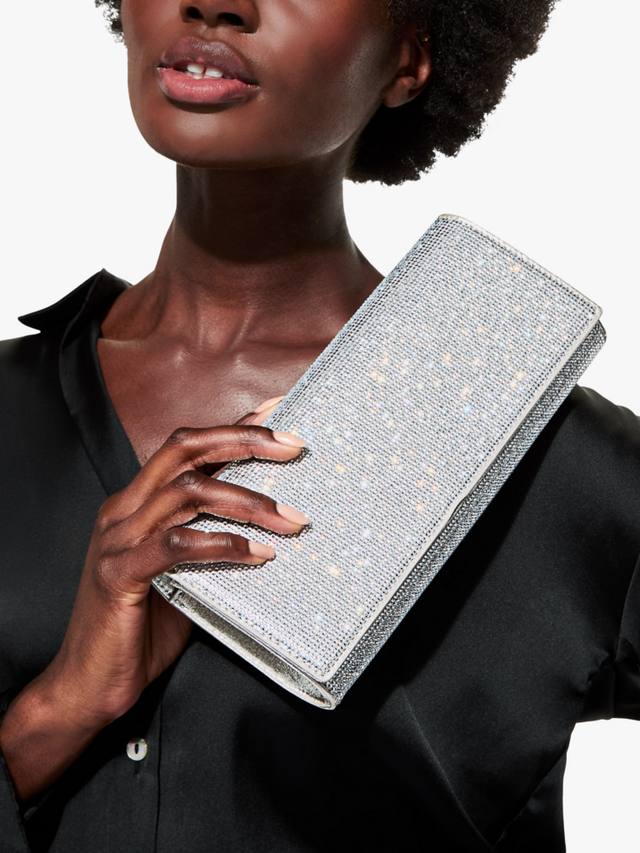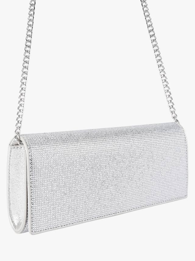 KG Kurt Geiger Baily — это удлиненная сумка-клатч из серебристой ткани с кристаллами. На задней стороне сумки находится маленькая булавка KG Kurt Geiger.