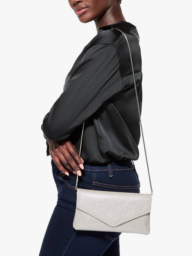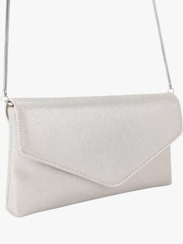 KG Kurt Geiger Bella — это сумка-клатч конверт из серебристой ткани. Сумка дополнена дополнительным серебристым ремешком, магнитной застёжкой под клапаном, отделением для телефонов диагональю до 7 дюймов и фирменной булавкой KG Kurt Geiger на задней стороне.