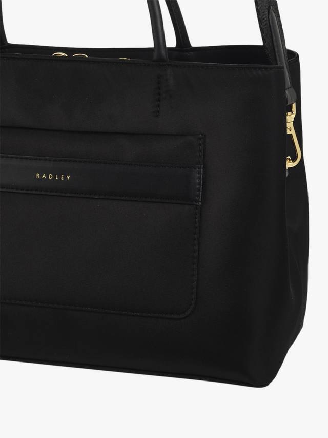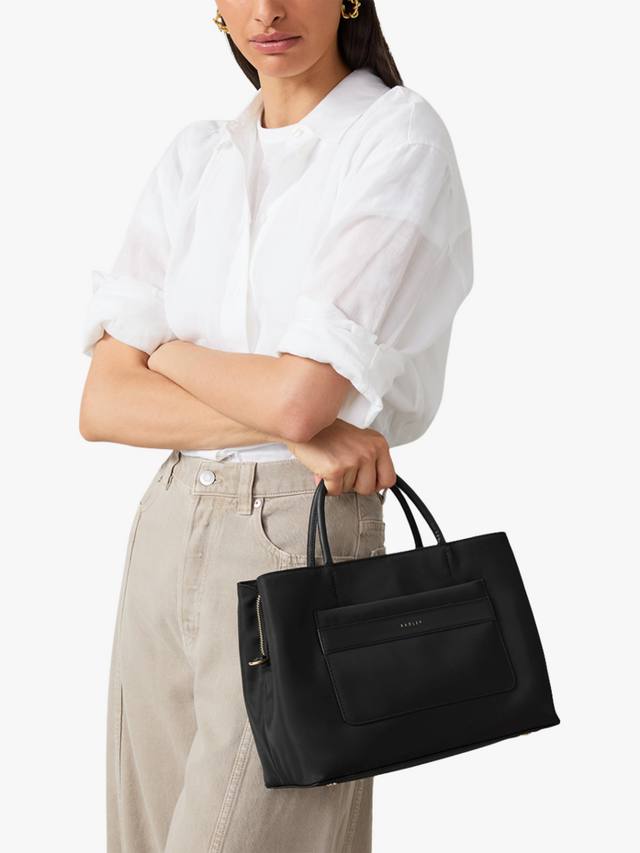 Изготовлено из переработанных пластиковых бутылок. Вместо того, чтобы отправляться на свалку, они были переработаны в переработанный полиэстер и использованы для создания ответственной сумки Holland Park Grab — лёгкой модели с тремя отделениями.