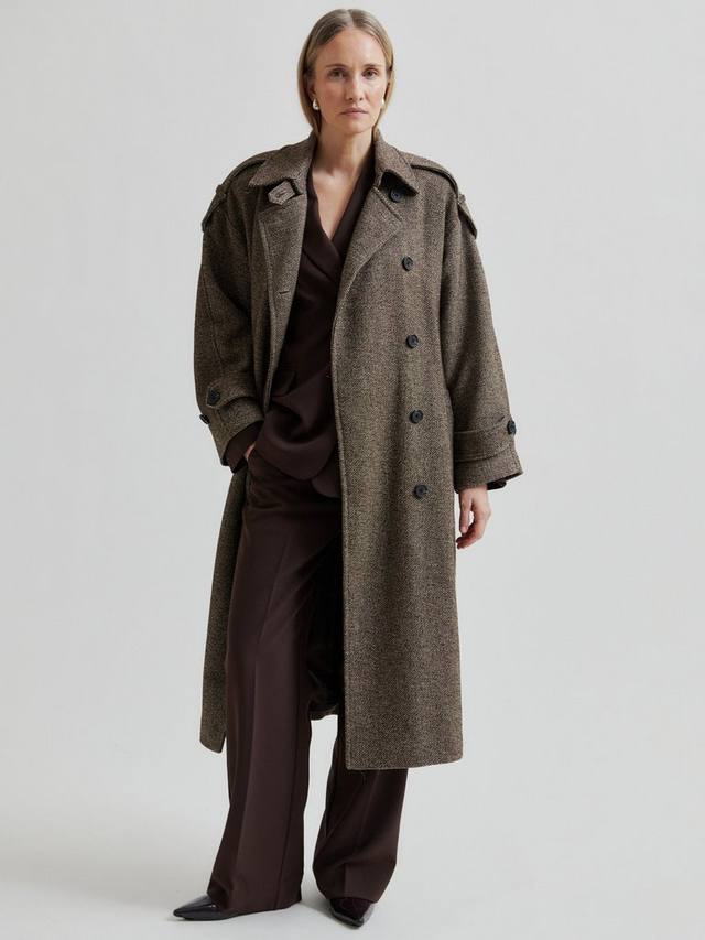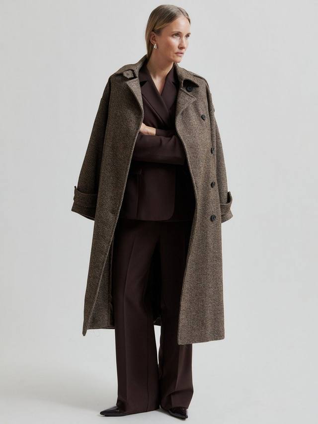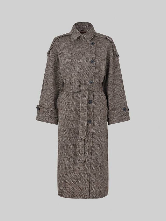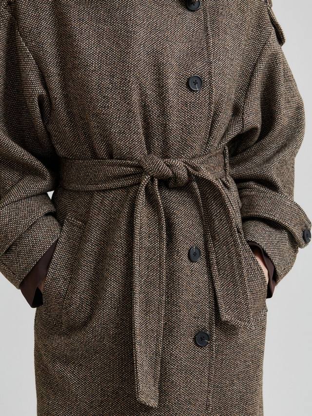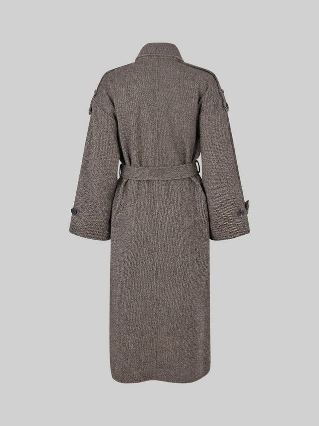 Второе женское длинное твидовое пальто. Классический воротник с застёжкой-молнией на горловине и смещенной застёжкой на пуговицы. Тканевый пояс на талии, бретели и пуговицы на плечах и манжетах. Два боковых кармана и разрез сзади. Полностью на подкладке. Стандартный крой, который можно утянуть ремнем.