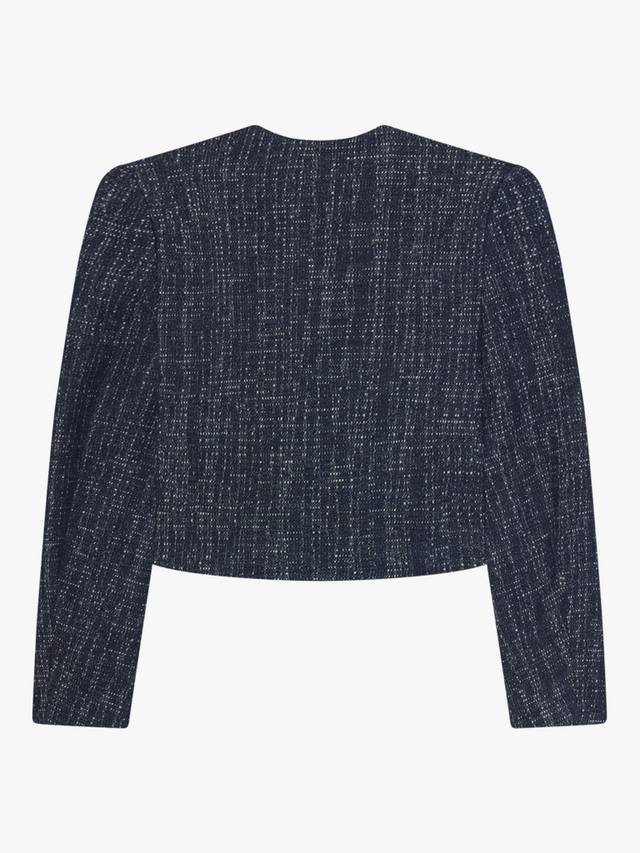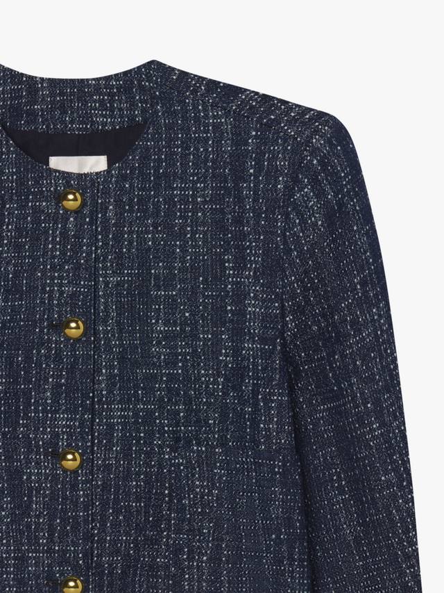 Глубокие оттенки придают этой классической модели современный вид. Этот шикарный твидовый блейзер отличается элегантным круглым вырезом и полированными золотистыми пуговицами на карманах на талии.