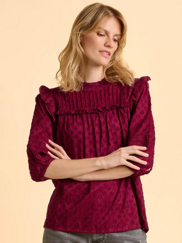 Эта легкая блузка насыщенного сливового оттенка с легкими синими акцентами — идеальное сочетание элегантности и комфорта.