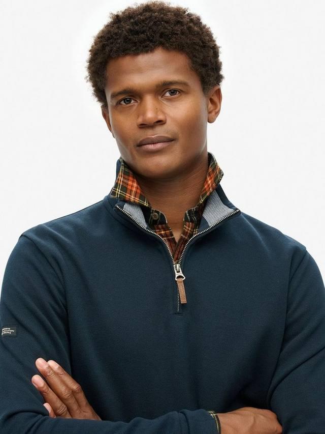 Элегантная толстовка с застежкой на четверть молнии из мягкой хлопковой смесовой ткани с текстурированным пике. Свободный крой идеально подходит для ношения поверх рубашек в прохладное время года.