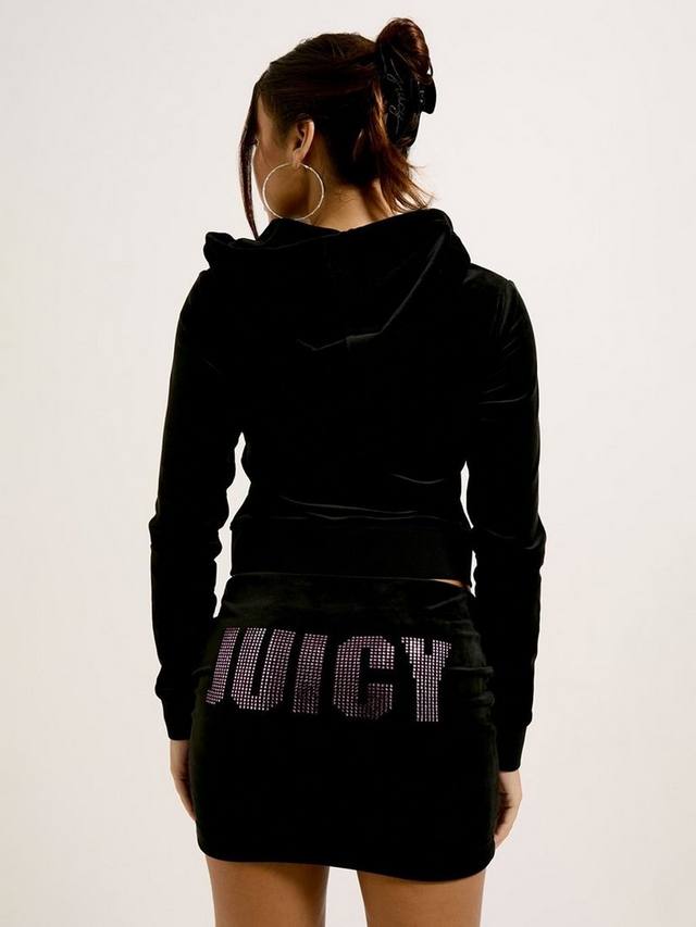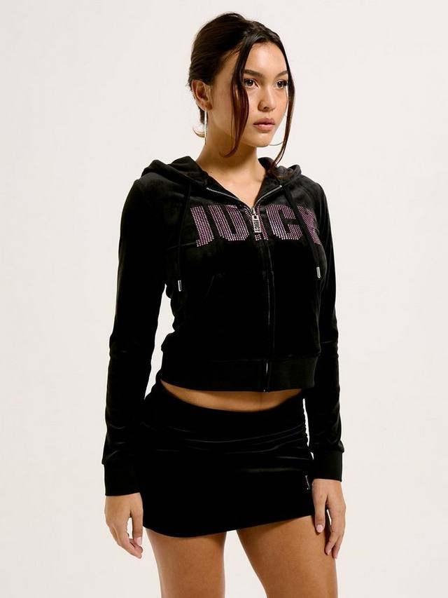 Приталенный фасон на молнии с капюшоном, передними карманами и фирменным логотипом Juicy, украшенным кристаллами и стразами. Капюшон на шнурке. Молния спереди. Карман-кенгуру