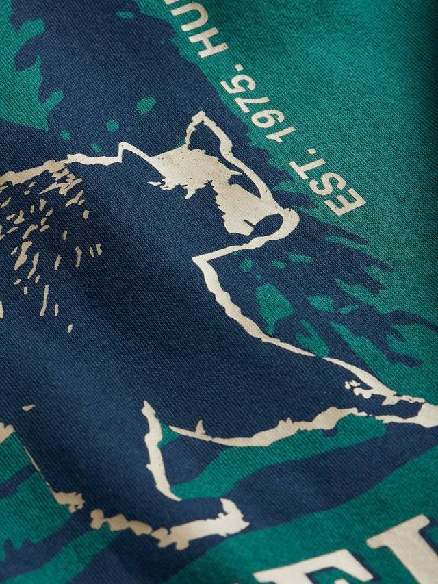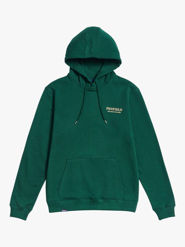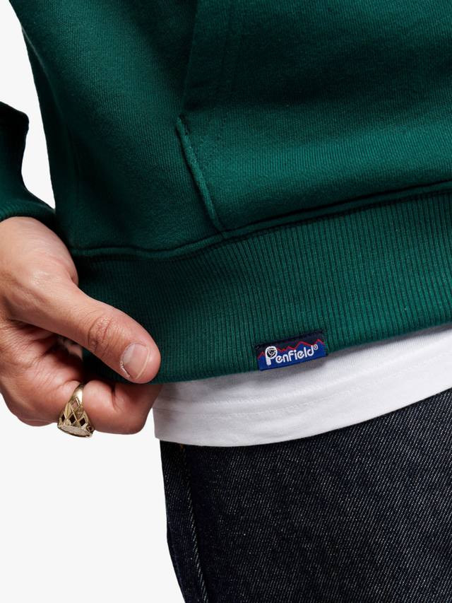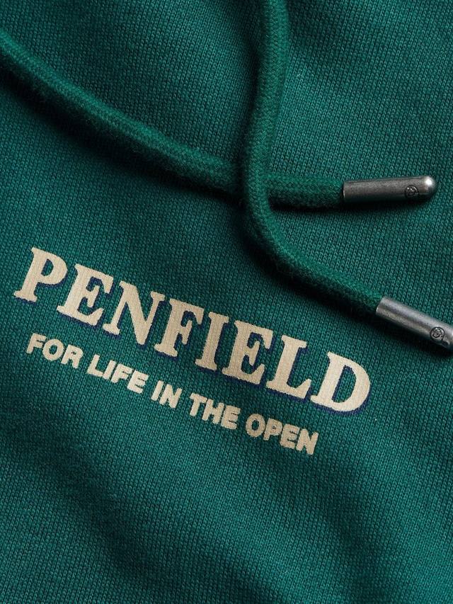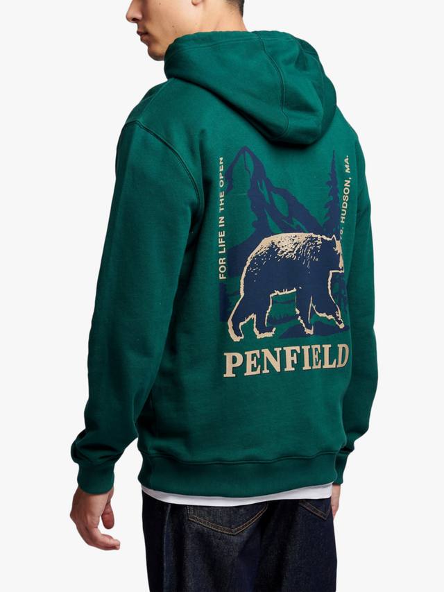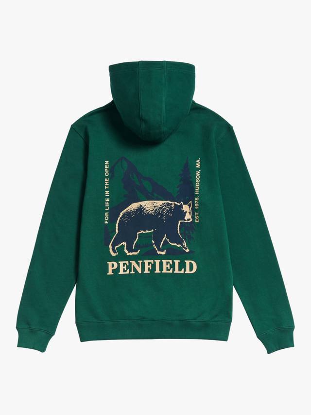 Изготовленная из трикотажной ткани с петлевой изнанкой плотностью 350 г/м², она обеспечивает воздухопроницаемость и мягкость. Свободный крой, ребристый подол и манжеты создают утонченный силуэт, а трёхсекционный капюшон обеспечивает тепло. Небольшой логотип на груди и большой рисунок черного медведя на спине напоминают о наследии Penfield, а тканый логотип на подоле добавляет аутентичности.