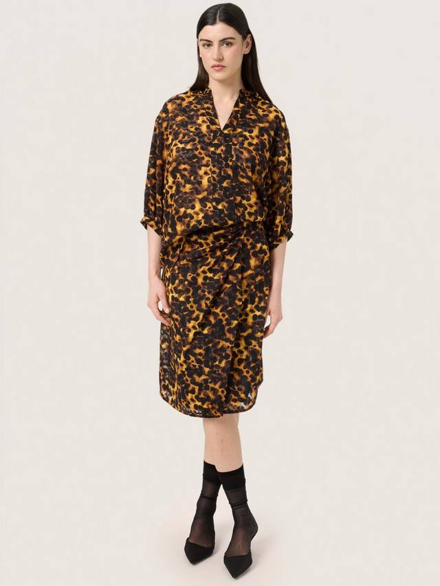 Блузка Gunvy — универсальный топ с ярким принтом. V-образный вырез, воротник-стойка и свободный крой со спущенными плечами. Рукава — 3/4, рукава-фонарики с узкими свободными манжетами, а подол блузки закруглённый сзади.