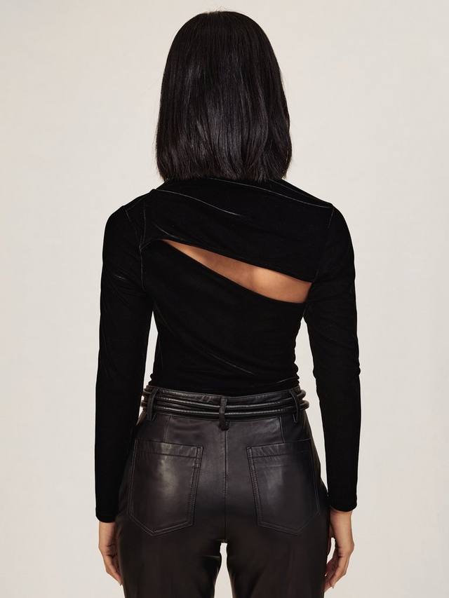 Скроенная по фигуре блузка от Reiss из мягкого бархата. Асимметричный вырез горловины и длинные рукава, однотонный цвет позволяют сочетать её с чем угодно. Идеальный вариант для вечеринки.