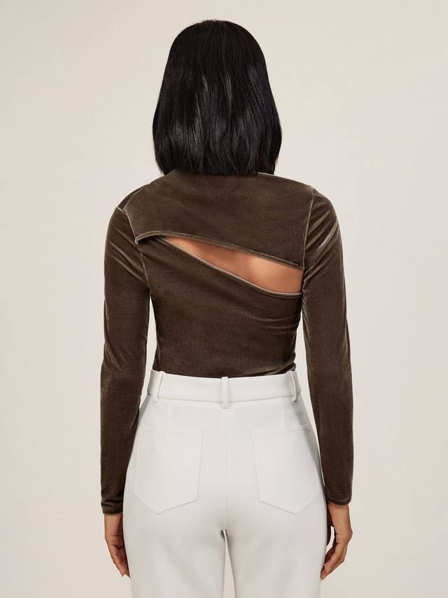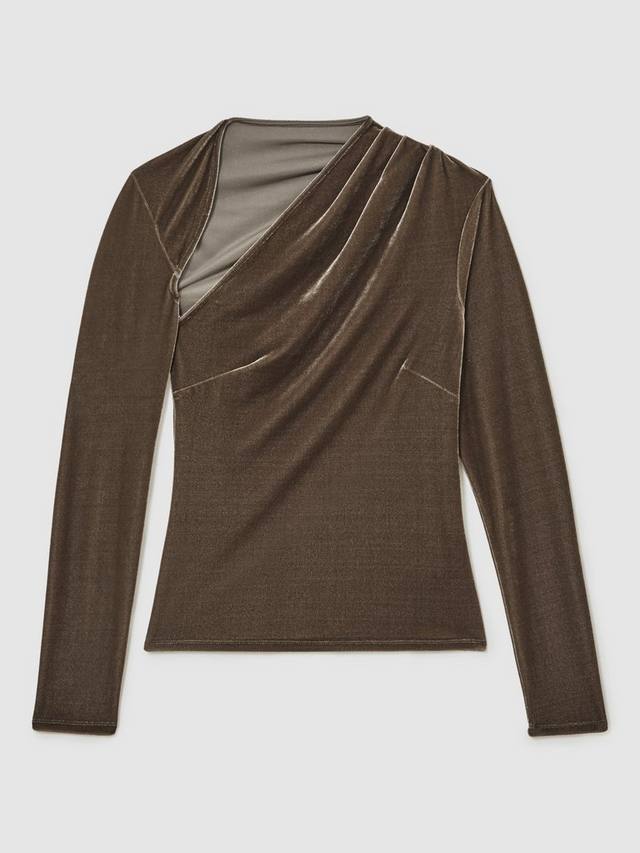 Скроенная по фигуре блузка от Reiss из мягкого бархата. Асимметричный вырез горловины и длинные рукава, однотонный цвет позволяют сочетать её с чем угодно. Идеальный вариант для вечеринки.