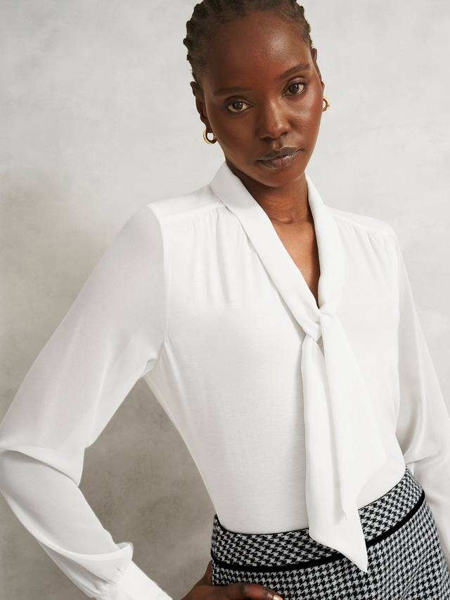 Ощутите моду на завязывающийся воротник с топом Tarini. Его можно носить в офисе с классическим строгим жакетом, вечером с каблуками и в выходные с джинсами.