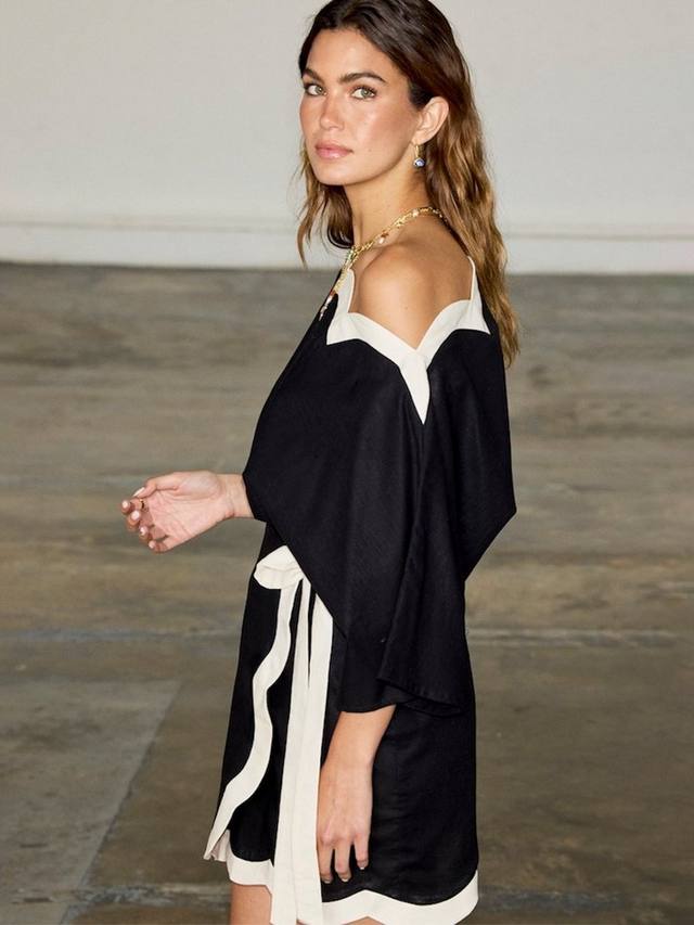 Эта блузка от Never Fully Dressed с контрастной белой отделкой в виде фестончатого края дополнена асимметричным вырезом и рукавами летучая мышь длиной до локтя. Изготовлена из льняной смеси, обеспечивающей воздухопроницаемость и лёгкость. Сочетайте её с юбкой-халатом для создания гармоничного образа или просто надевайте с джинсами.