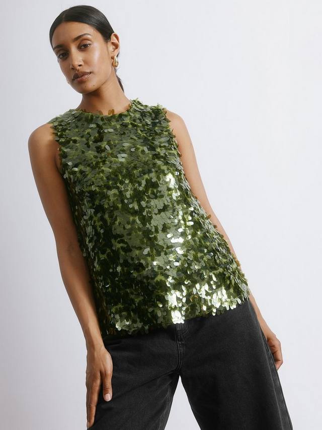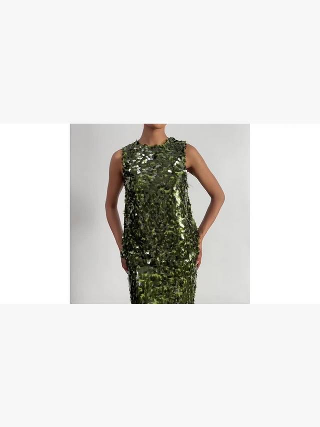 Этот топ-футляр украшен крупными каплевидными пайетками характерного оттенка, который элегантно отражает свет, создавая мерцающий эффект при движении.