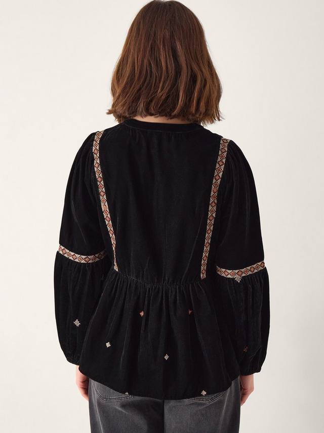 Туника-блузка от Monsoon из мягкого бархата. Завязывающийся на шее воротник с кисточками и длинные рукава дополнены изысканной вышивкой. Повседневная, удобная и непринужденно шикарная.