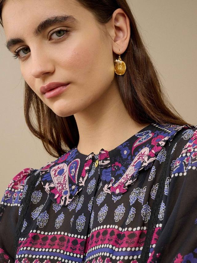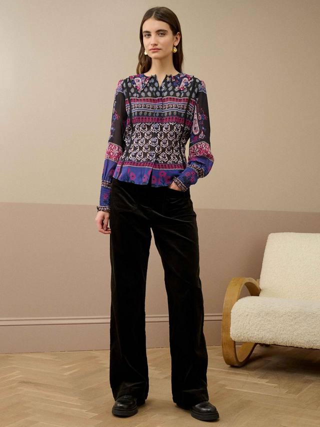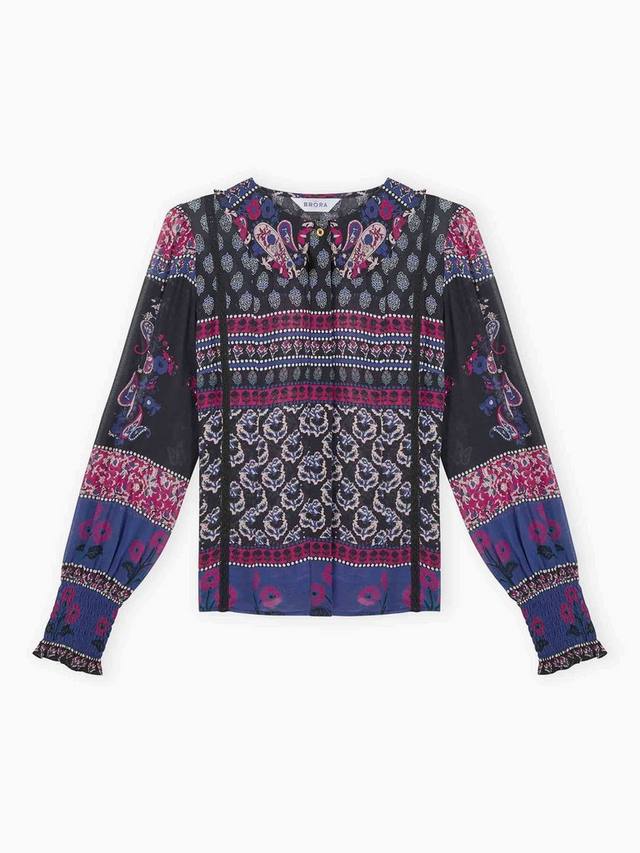 Готовы заявить о себе в стиле? Brora предлагает вам эту роскошную шелковую блузку с ярким лоскутным дизайном, присборенными манжетами, потайной планкой, кружевными вставками и женственным воротником-оборкой.