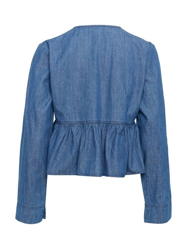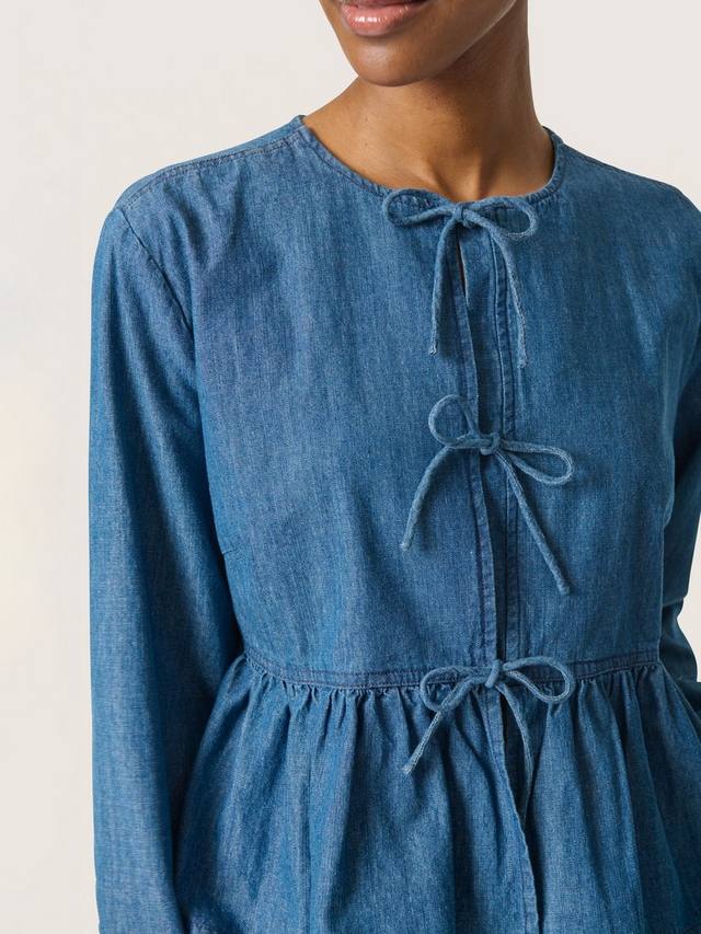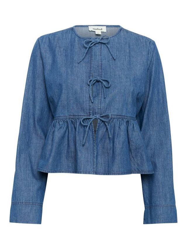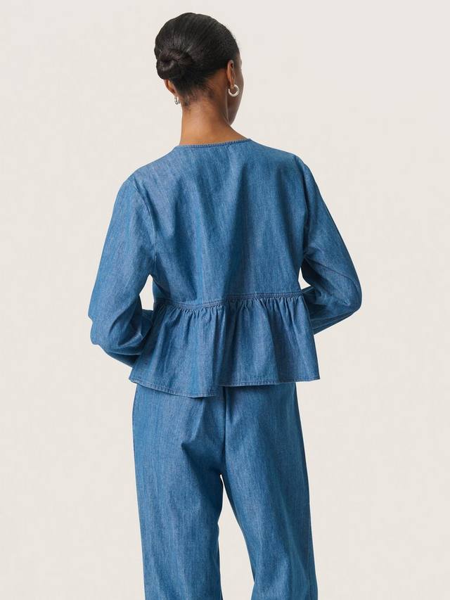 Блузка Chamy — стильное и универсальное дополнение к любому гардеробу. Она сшита из мягкой ткани шамбре с изящной баской на талии и завязками, придающими ей женственность.