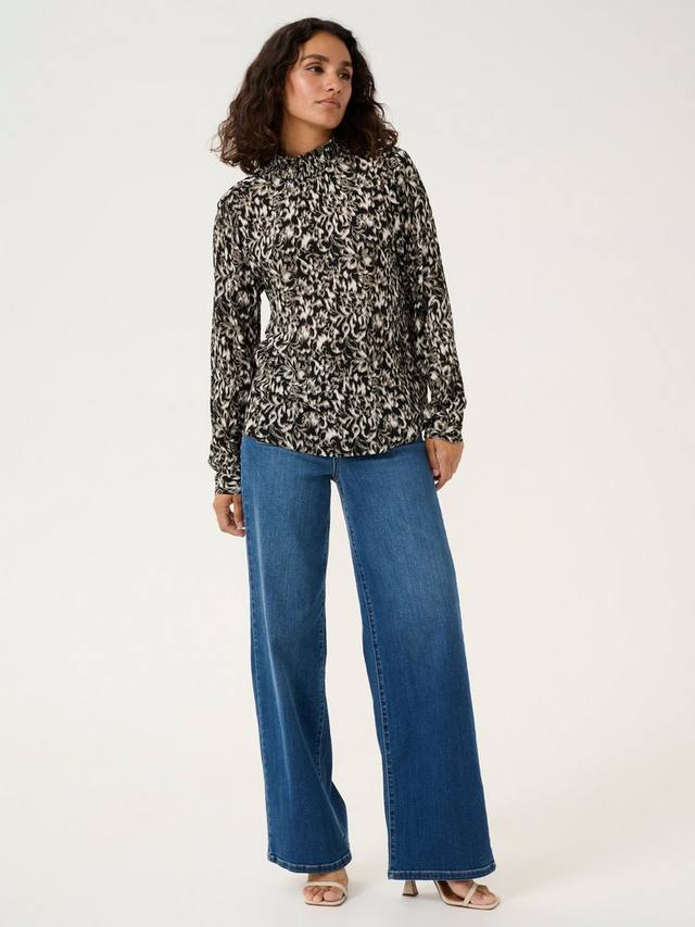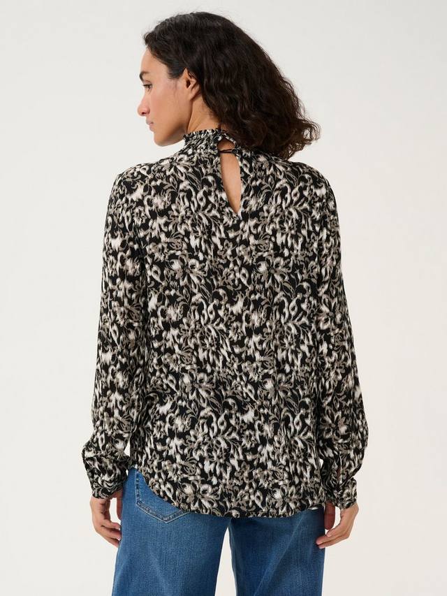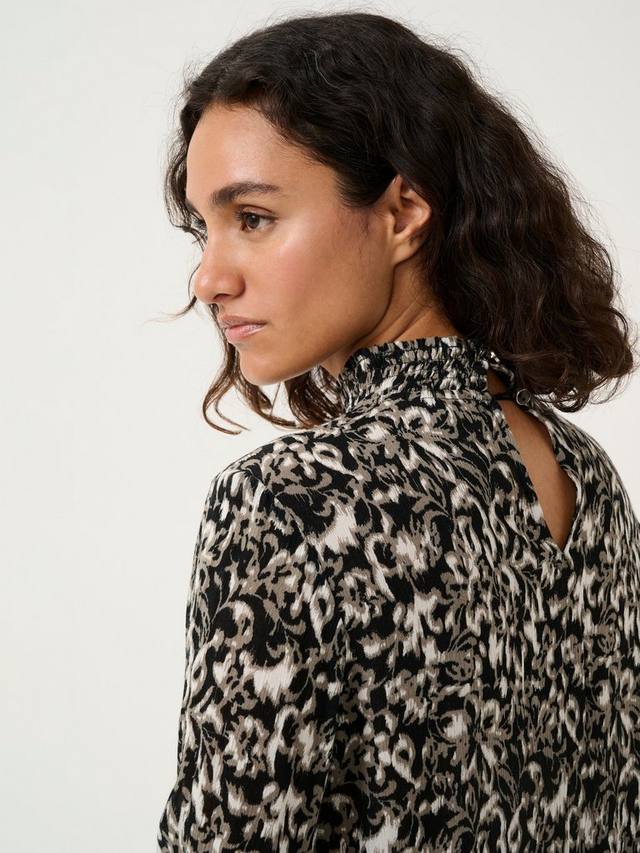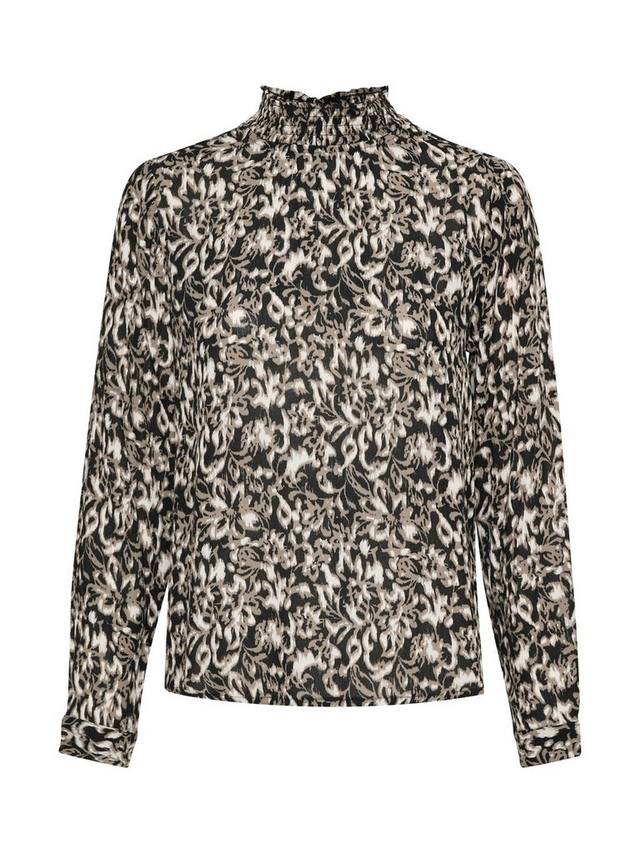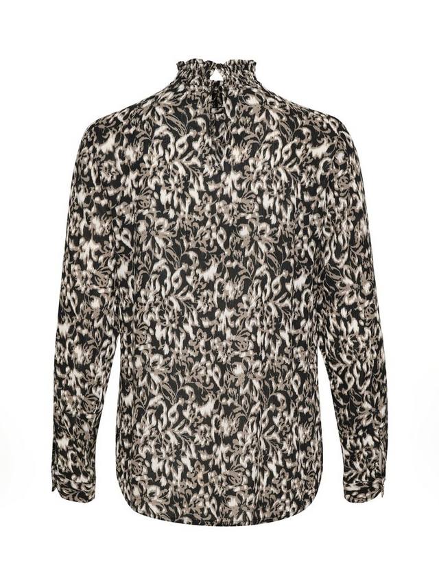 Янтарная блузка представляет собой напечатанный топ с высоким воротником-стойкой. Горловина застегивается на две пуговицы сзади, а снизу — вырез-замочная скважина. Рукава длинные и свободные, собраны в манжету на пуговицах. Блузка имеет классический крой и подходит для любого случая.
