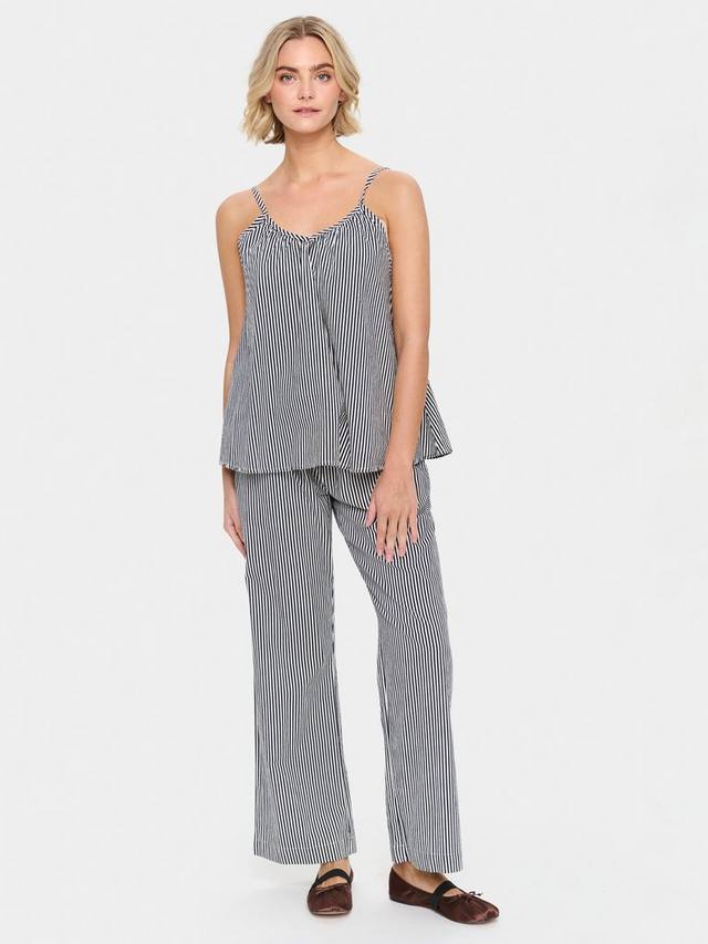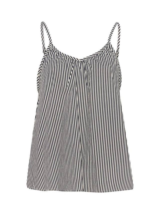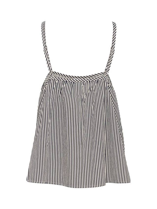 Топ Zalinda — это повседневный и привлекательный топ из полосатой ткани. Он без рукавов, с регулируемыми тонкими бретельками и V-образным вырезом. Топ имеет свободный А-образный крой и вырез на бедрах.