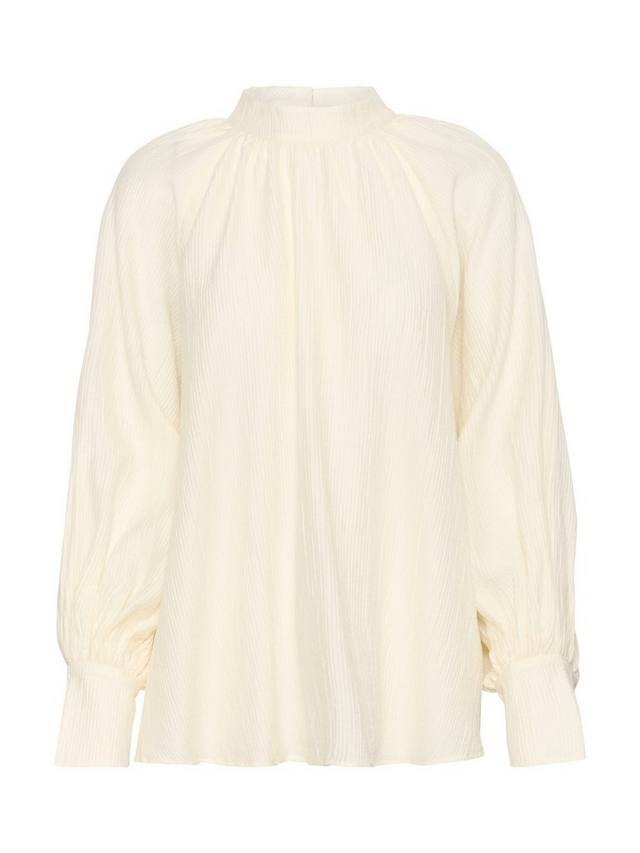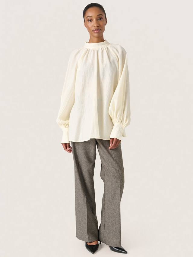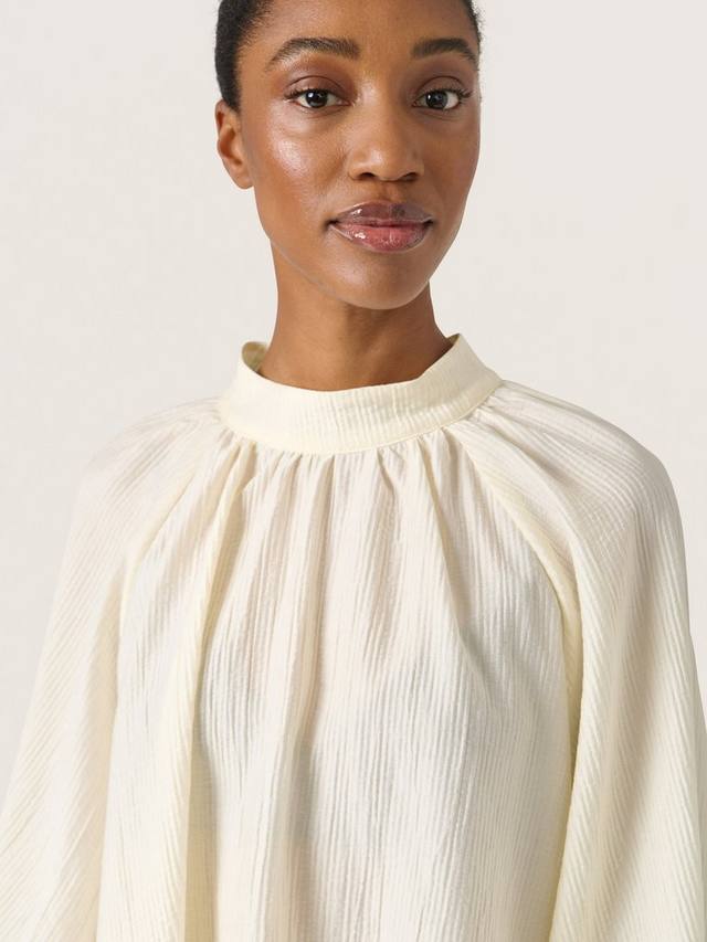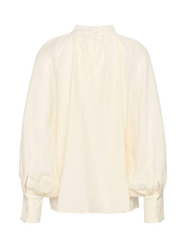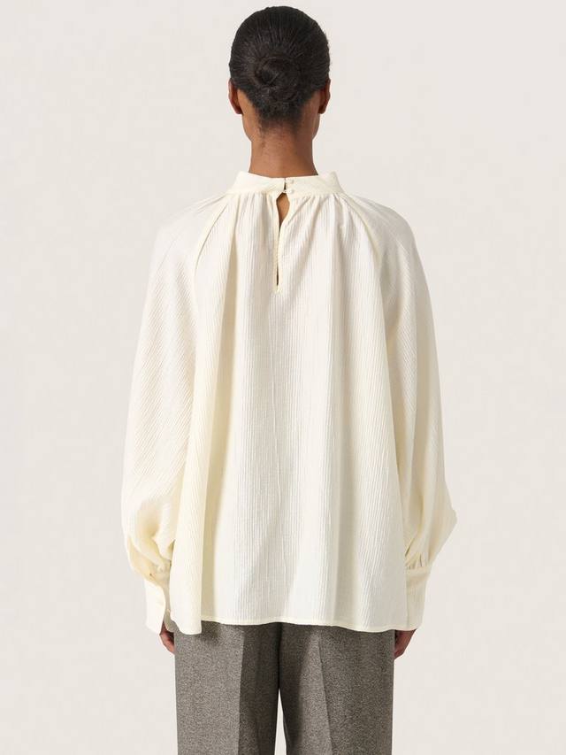 Блузка Natalja — это простой и элегантный топ, который добавит мягкости любому образу. У нее высокий ворот с застежкой на пуговицы сзади, свободный крой и легкая ткань. Рукава длинные и объемные реглан с широкими манжетами, а блузка имеет вырез чуть ниже бедер.