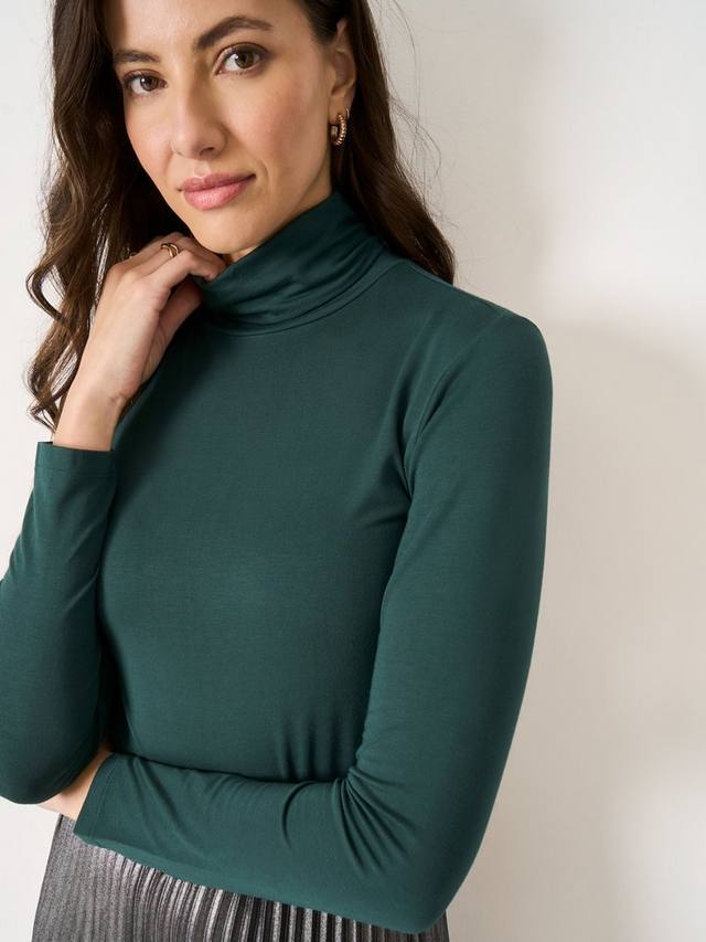 Топ из модального джерси с высоким воротом. Изящный и элегантный, этот топ изготовлен из модального смесового материала, известного своей исключительной мягкостью, воздухопроницаемостью и превосходным качеством. Идеальный зимний слой, сочетающийся с джинсами, платьями и трикотажем.